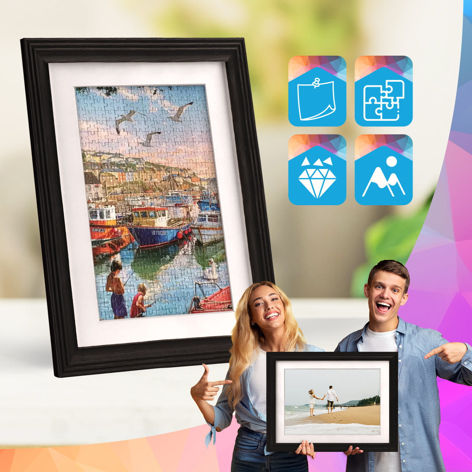 The frame can be displayed on furniture or on the wall. Thanks to the carefully crafted frame profile, the whole thing adheres firmly to the surface, and the presented motif remains the central element of the decoration. The frame is perfect for the home, office and gallery walls.