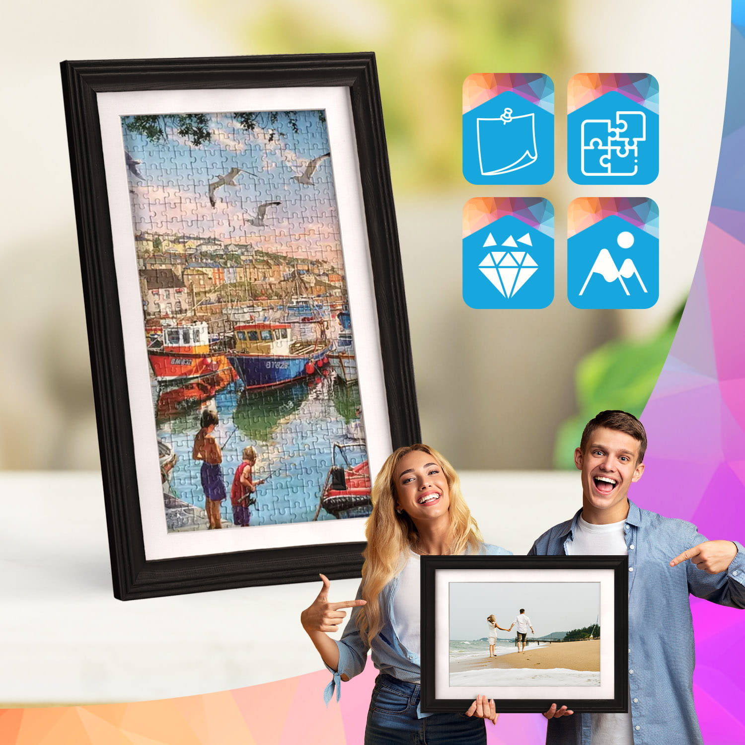 The frame can be displayed on furniture or on the wall. Thanks to the carefully crafted frame profile, the whole thing adheres firmly to the surface, and the presented motif remains the central element of the decoration. The frame is perfect for the home, office and gallery walls.