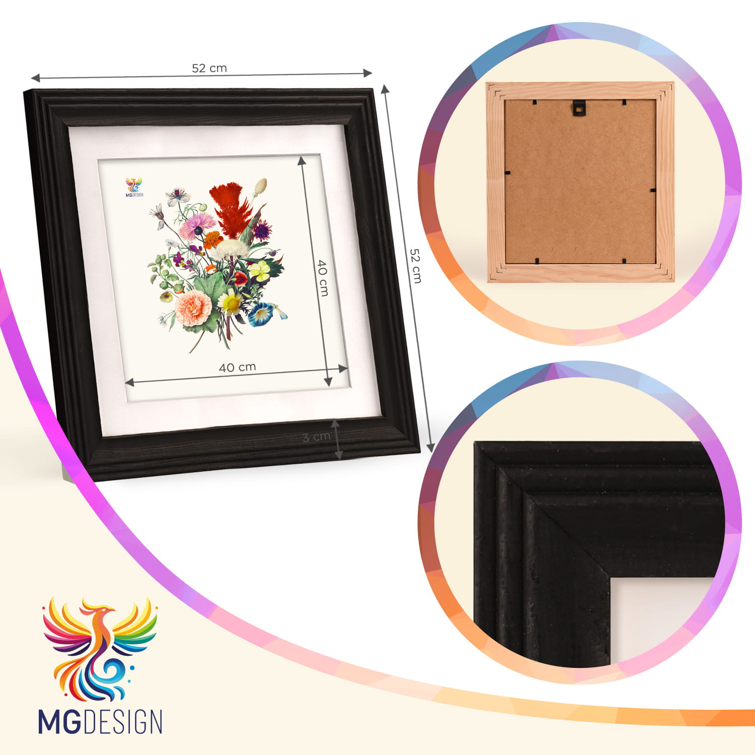 The frame can be displayed on furniture or on the wall. Thanks to the carefully crafted frame profile, the whole thing adheres firmly to the surface, and the presented motif remains the central element of the decoration. The frame is perfect for the home, office and gallery walls.