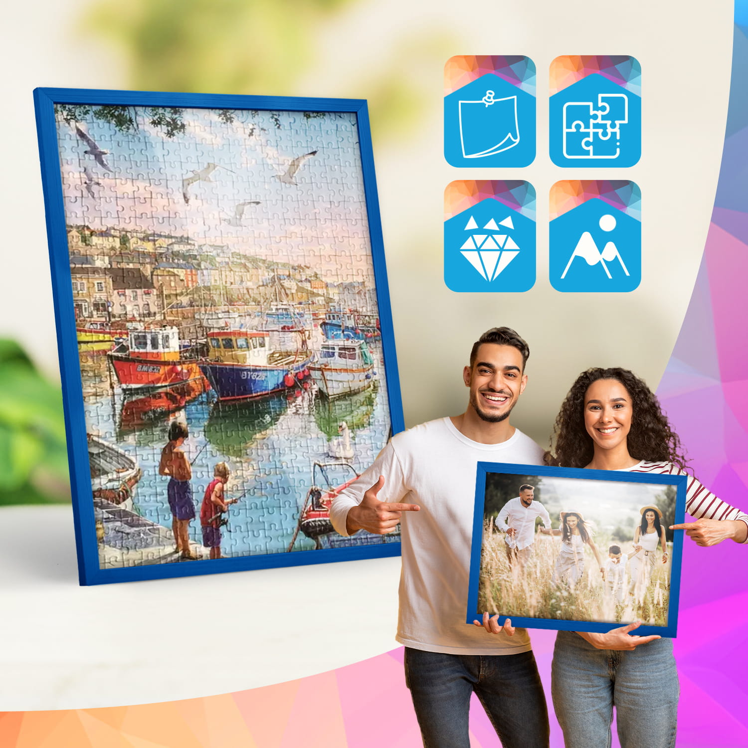 Blue photo frame 19 x 27 in (48 x 68,3 cm), made of natural wood