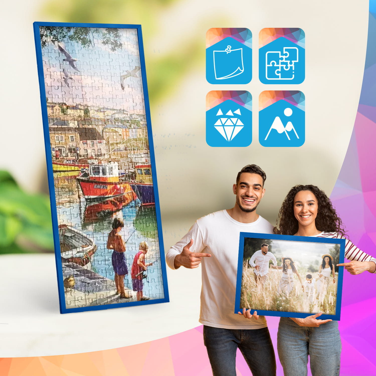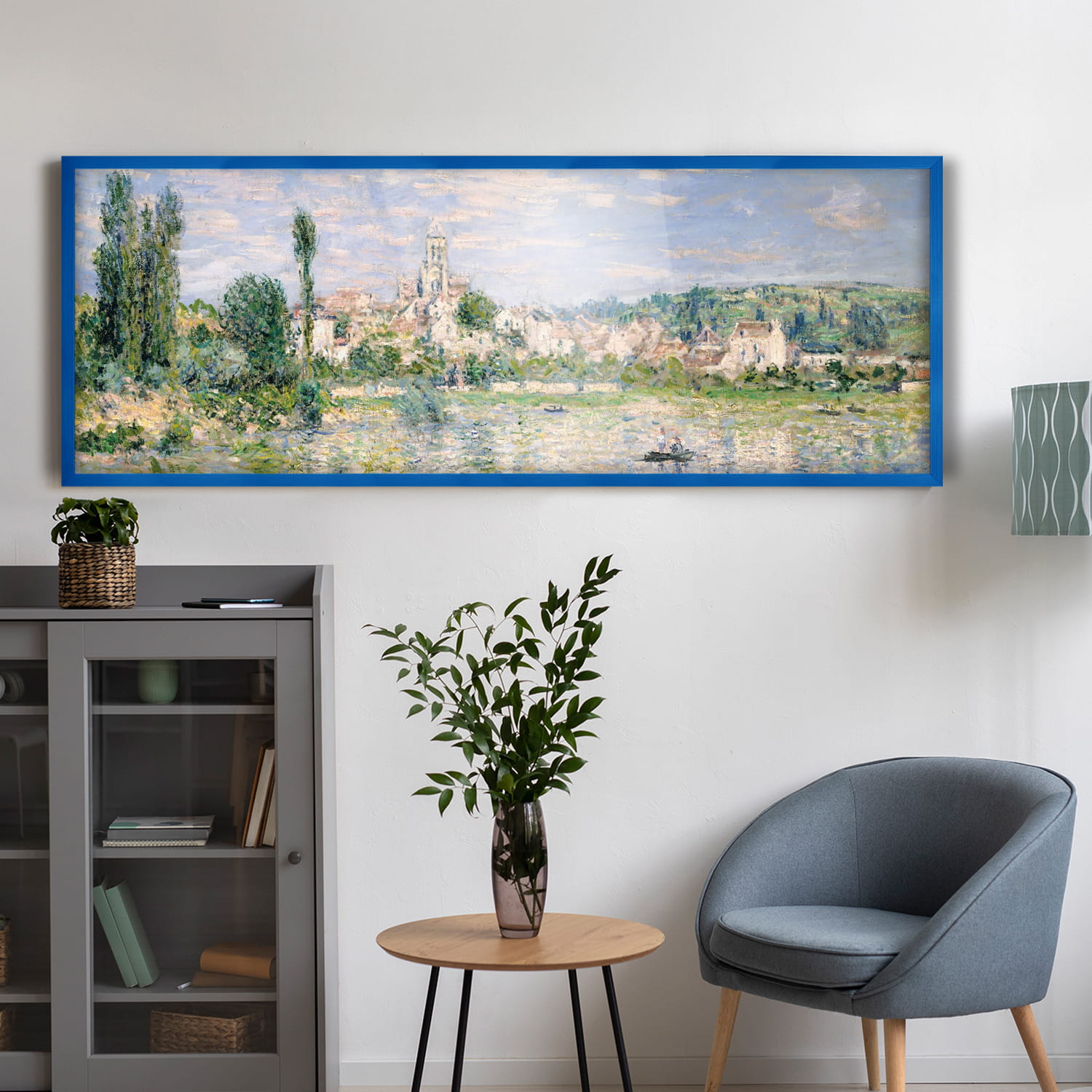 Blue photo frame 20 x 55 in (50 x 140 cm), made of natural wood