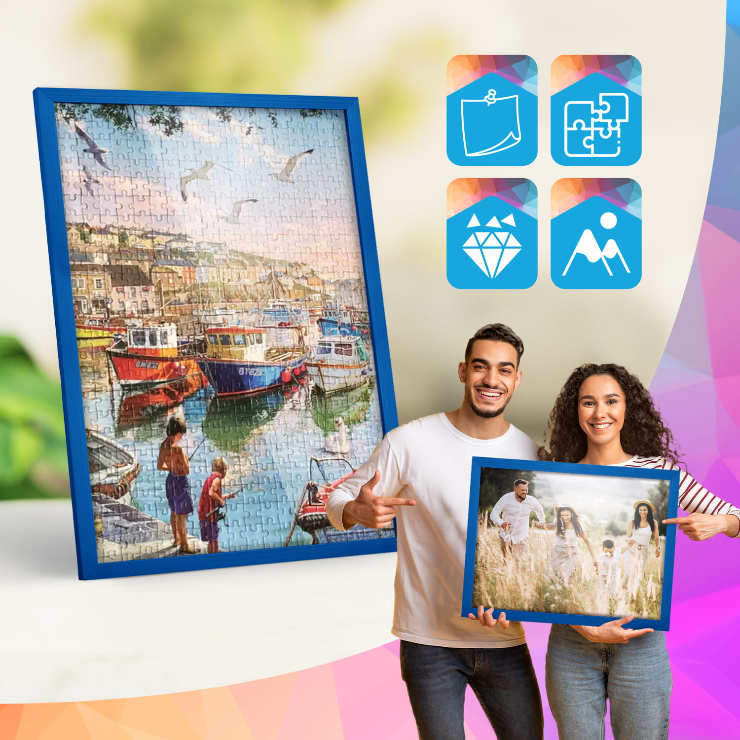 Blue photo frame 24 x 32 in (60 x 80 cm), made of natural wood