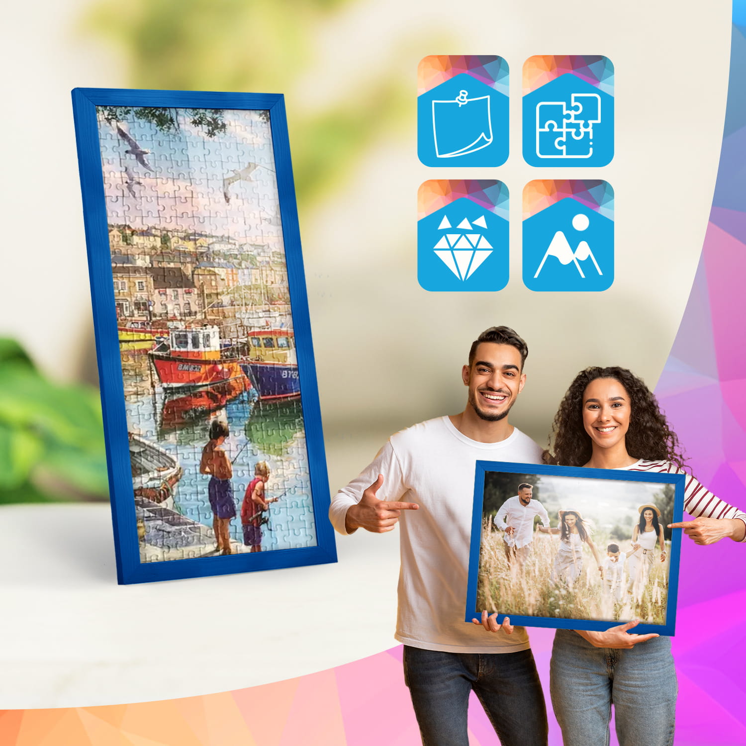 Blue photo frame 8 x 20 in (20 x 50 cm), made of natural wood
