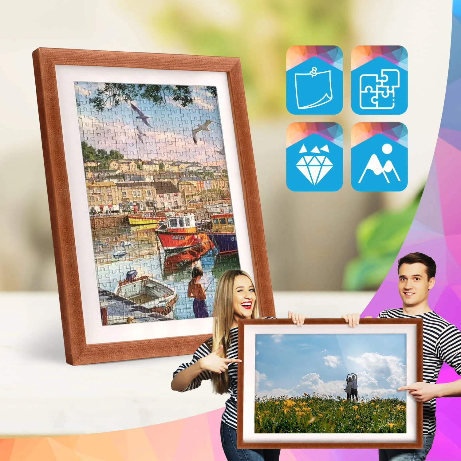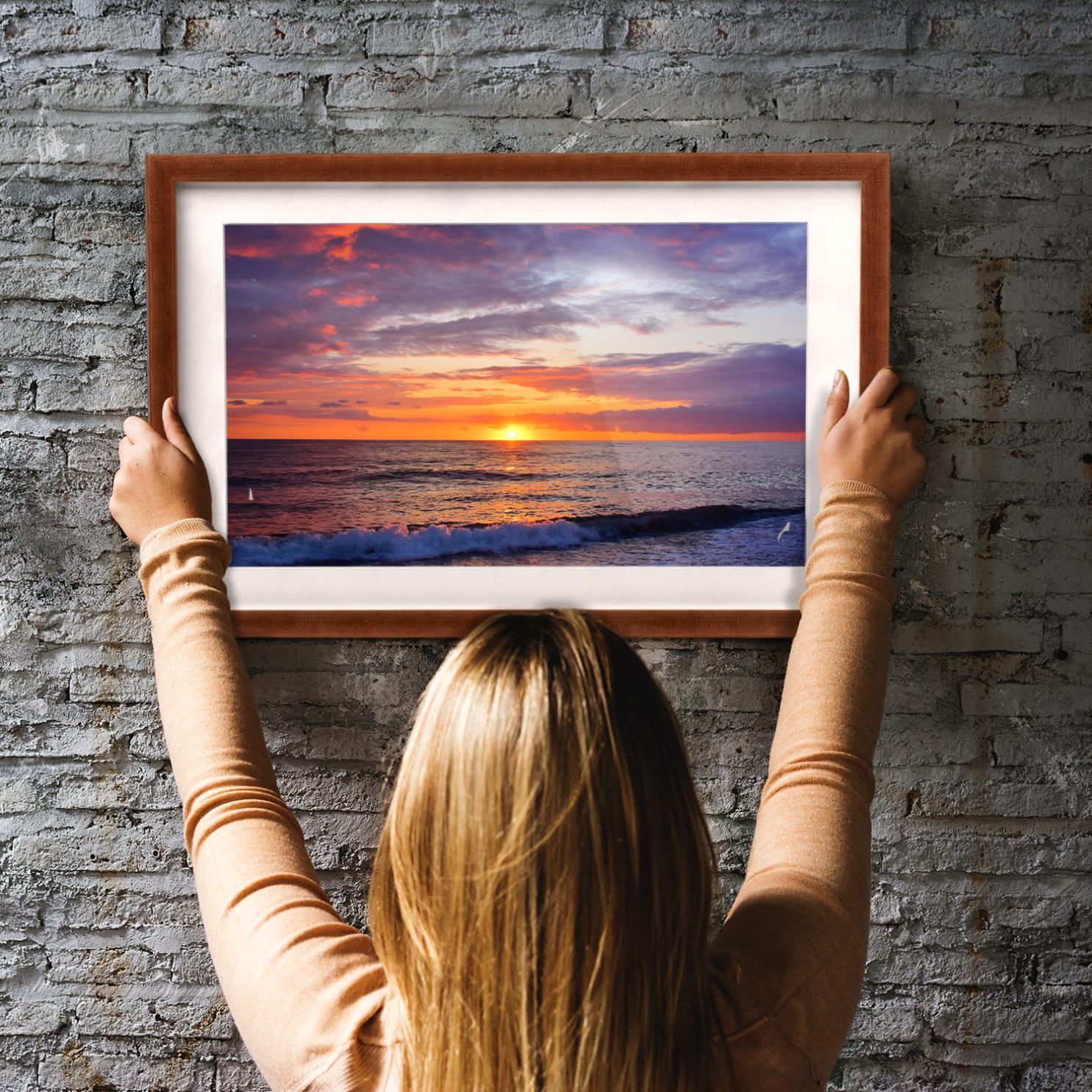 The frame can be placed on furniture or hung on the wall. Thanks to its high profile, it achieves a modern effect of distancing the image from the surface, which looks good in both home and commercial interiors.