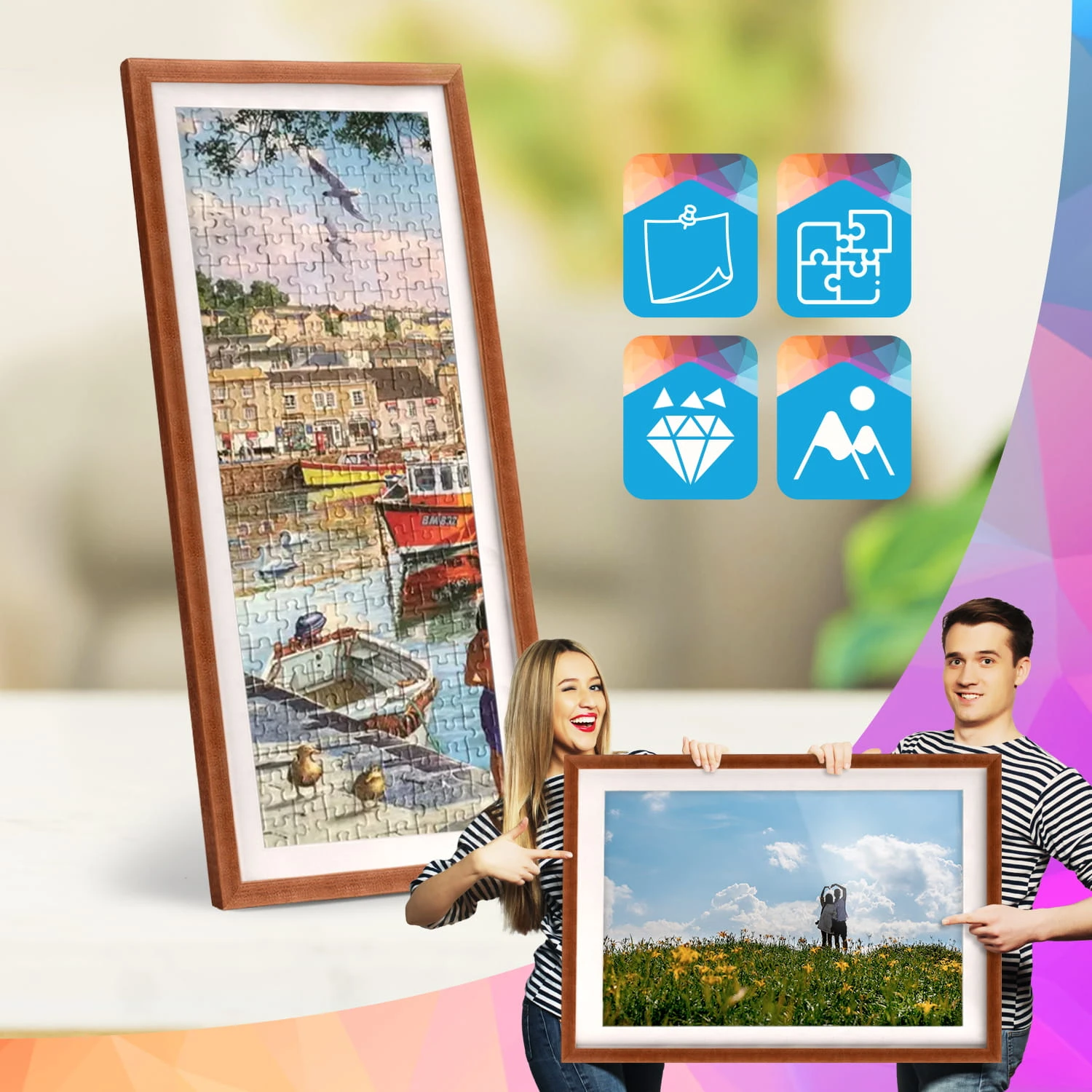 The frame can be placed on furniture or hung on the wall. Thanks to its high profile, it achieves a modern effect of distancing the image from the surface, which looks good in both home and commercial interiors.