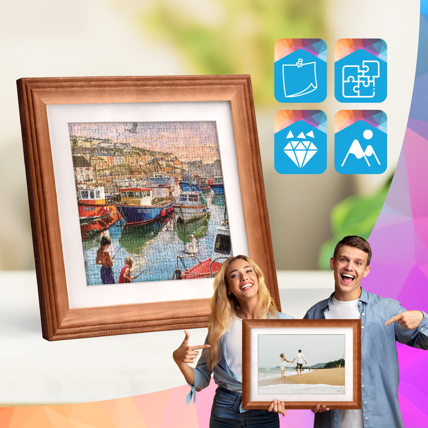 The frame can be displayed on furniture or on the wall. Thanks to the carefully crafted frame profile, the whole thing adheres firmly to the surface, and the presented motif remains the central element of the decoration. The frame is perfect for the home, office and gallery walls.