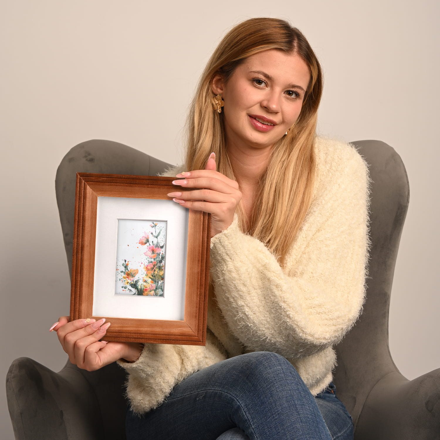 The frame is made of natural wood, carefully processed to preserve the visible structure of the material, which gives the whole a natural and timeless character. The front of the frame is made of lightweight and damage-resistant plexiglass, ensuring safety and good visibility of the framed work compared to traditional glass.