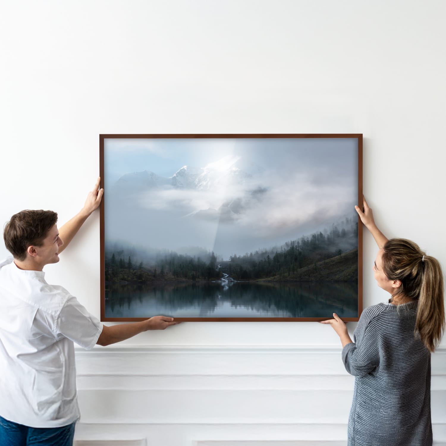 A wooden frame is an aesthetic and universal solution for framing photos, posters, graphics and decorative prints. The classic frame profile gives the frame an elegant look and clearly emphasises the presented motif without dominating the content. The frame is made of carefully processed natural wood, preserving the visible structure of the material, which gives the whole a natural and timeless character. The front of the frame is made of lightweight and damage-resistant plexiglass, which is a safer alternative to traditional glass and ensures good visibility of the framed work. The stable HDF board and solid metal hangers allow for quick installation and easy replacement of the contents without the use of tools.