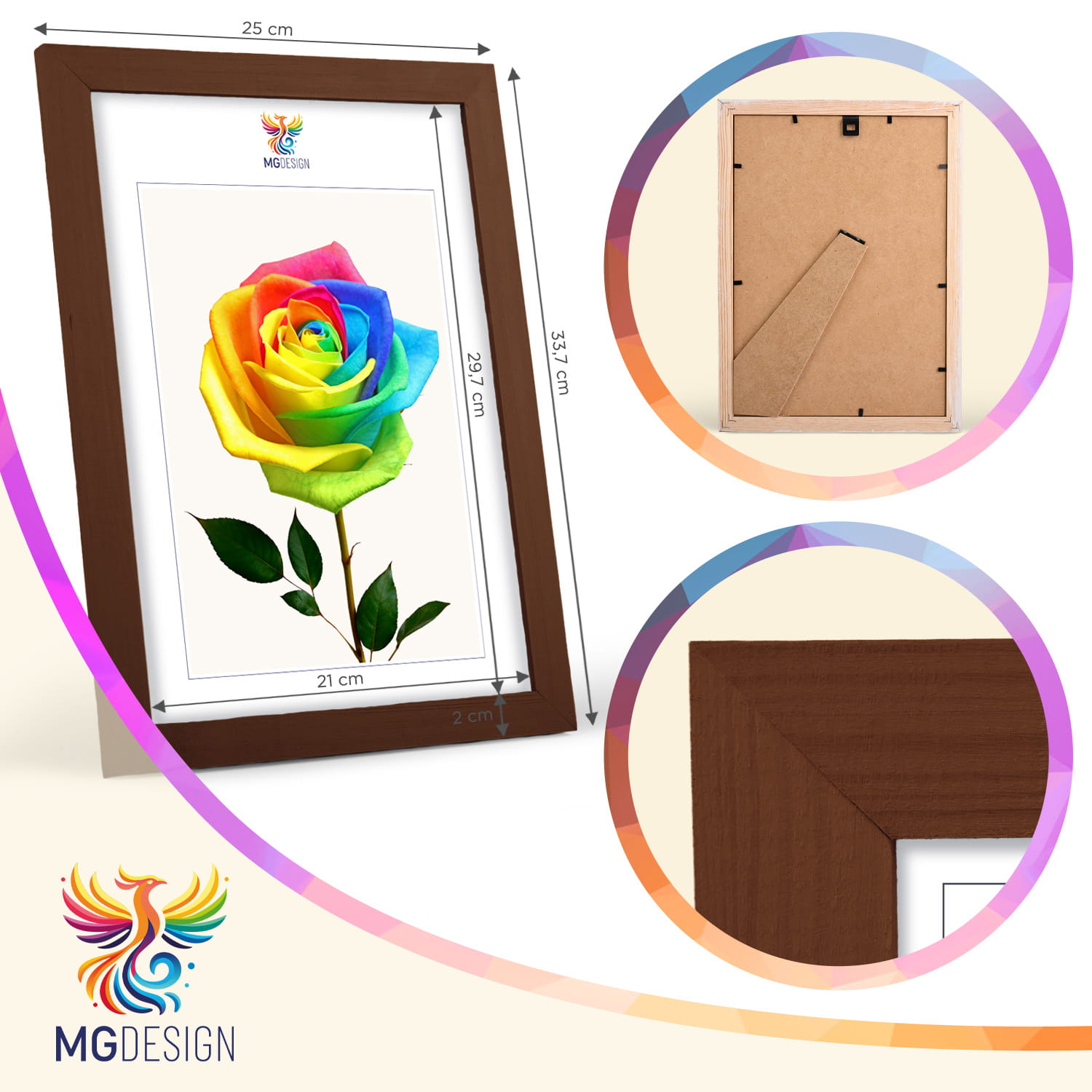 A wooden frame is an aesthetic and universal solution for framing photos, posters, graphics and decorative prints. The classic frame profile gives the frame an elegant look and clearly emphasises the presented motif without dominating the content. The frame is made of carefully processed natural wood, preserving the visible structure of the material, which gives the whole a natural and timeless character. The front of the frame is made of lightweight and damage-resistant plexiglass, which is a safer alternative to traditional glass and ensures good visibility of the framed work. The stable HDF board and solid metal hangers allow for quick installation and easy replacement of the contents without the use of tools.