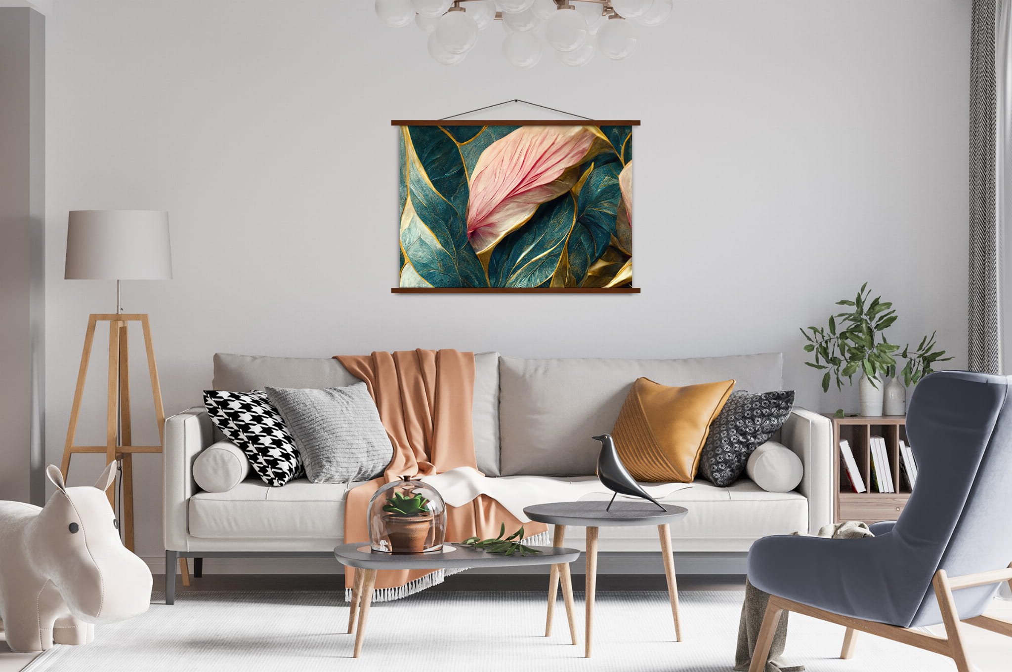 - Magnetic wooden strip system – securely holds prints without traditional frames