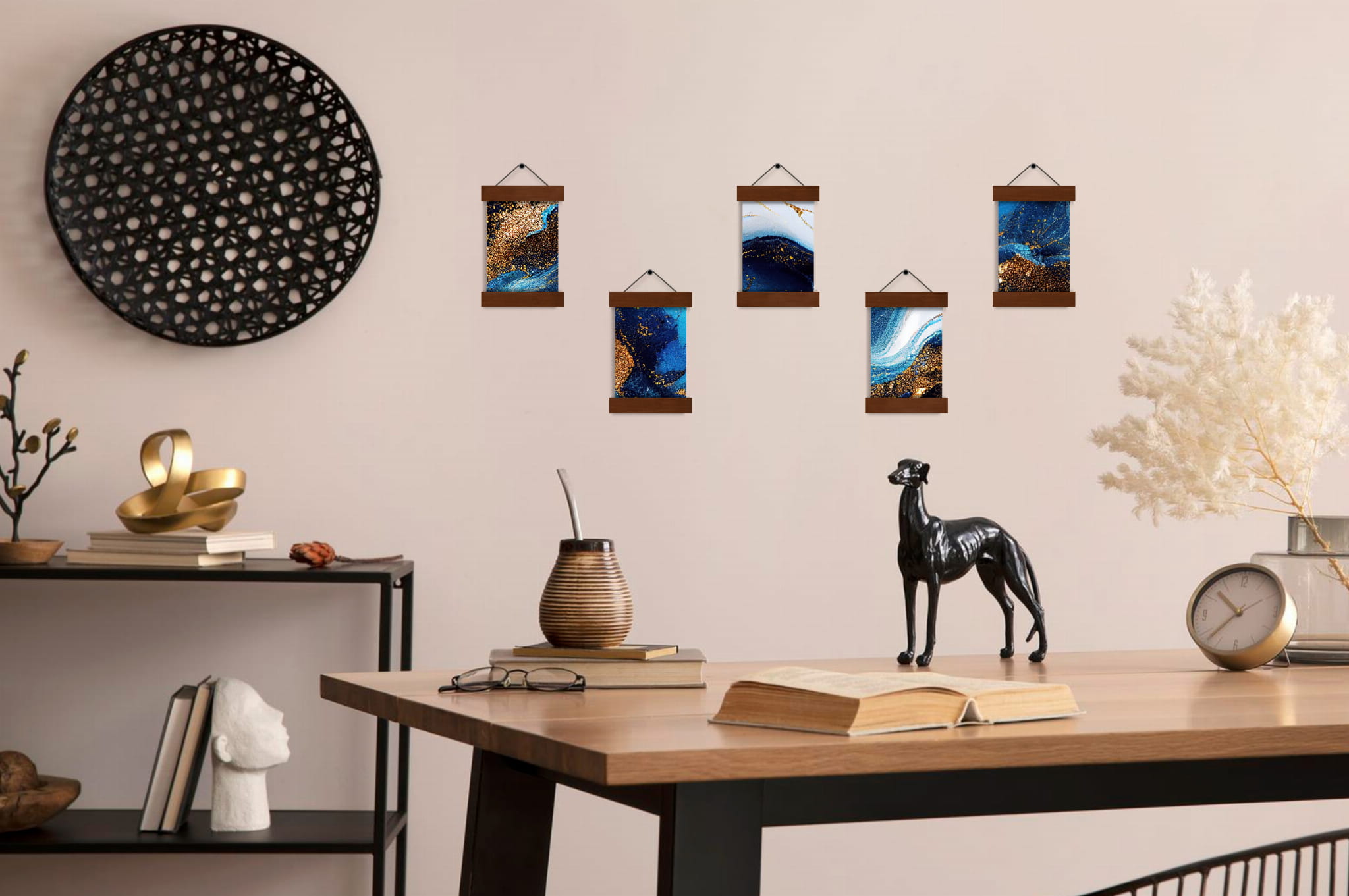 - Magnetic wooden strip system – securely holds prints without traditional frames