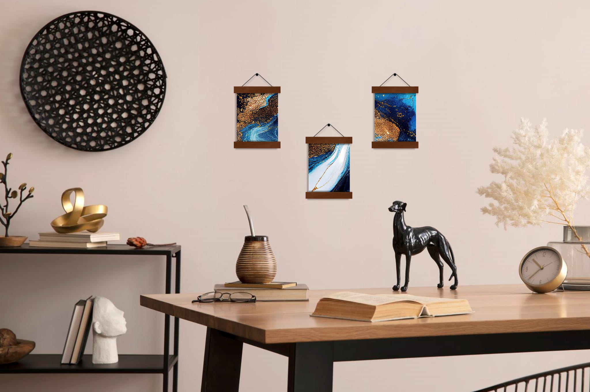 - Magnetic wooden strip system – securely holds prints without traditional frames