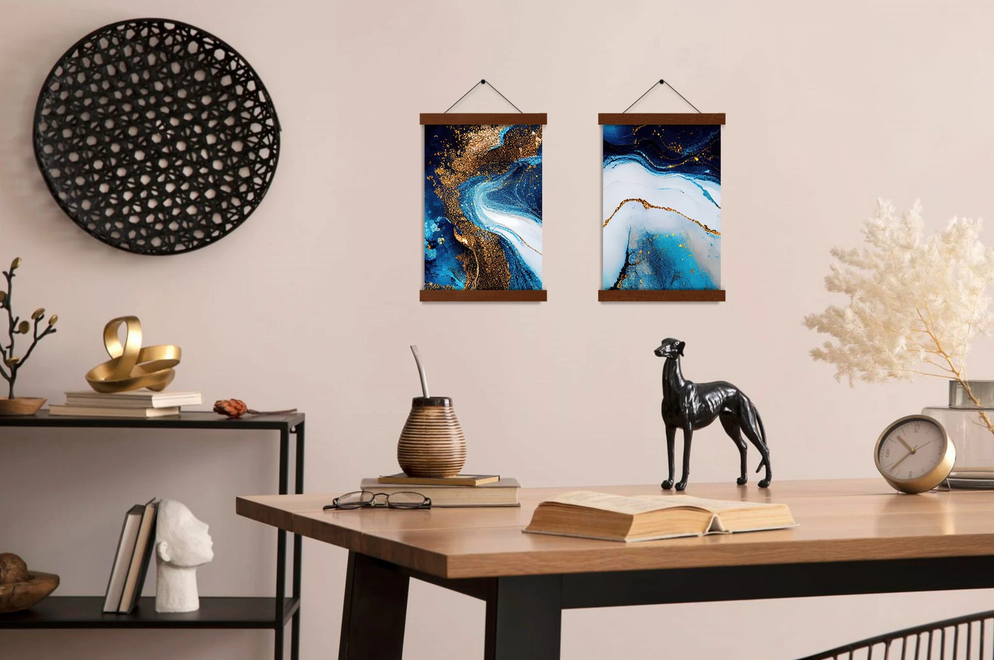- Magnetic wooden strip system – securely holds prints without traditional frames