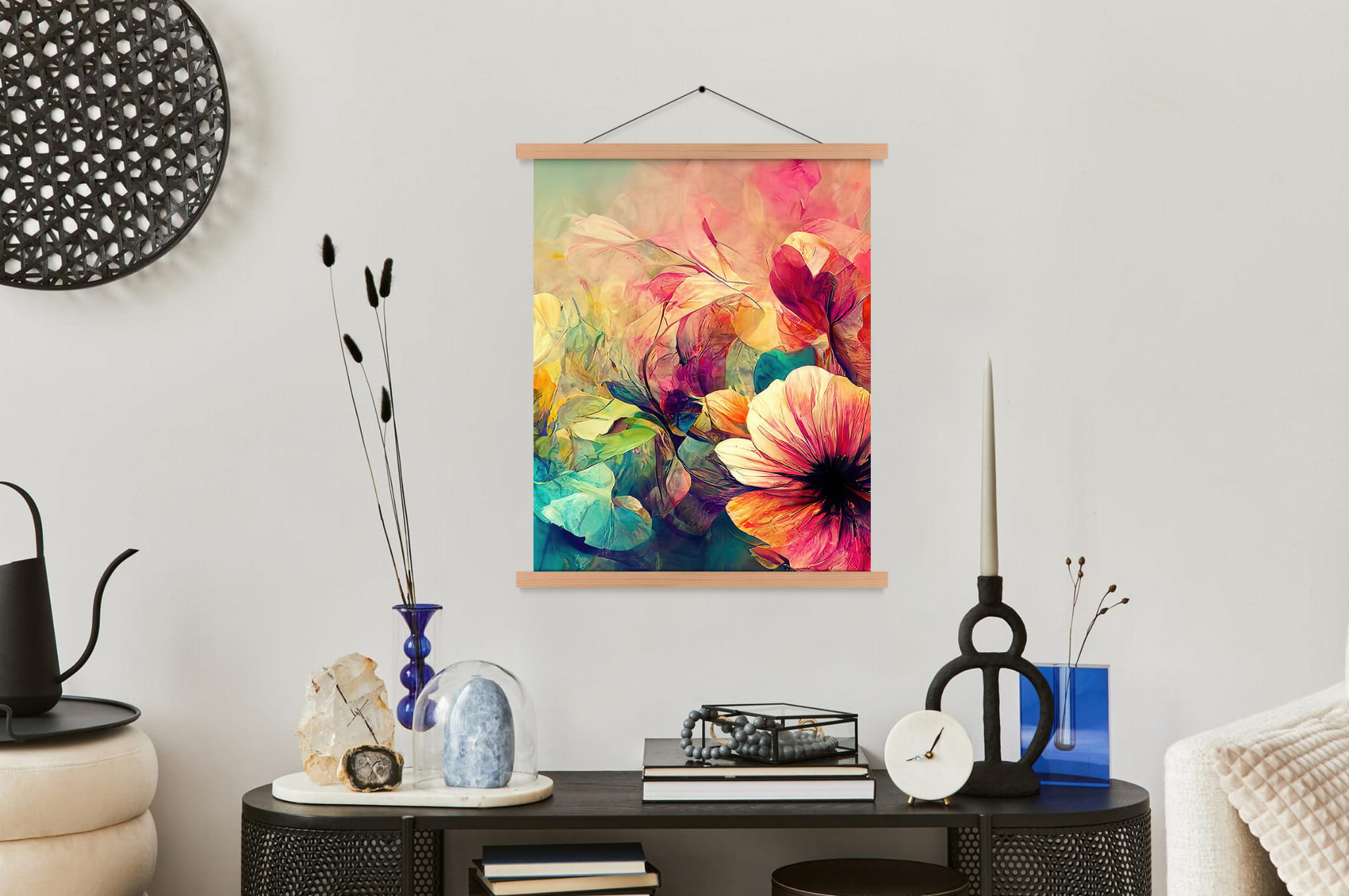 - Magnetic wooden strip system – securely holds prints without traditional frames