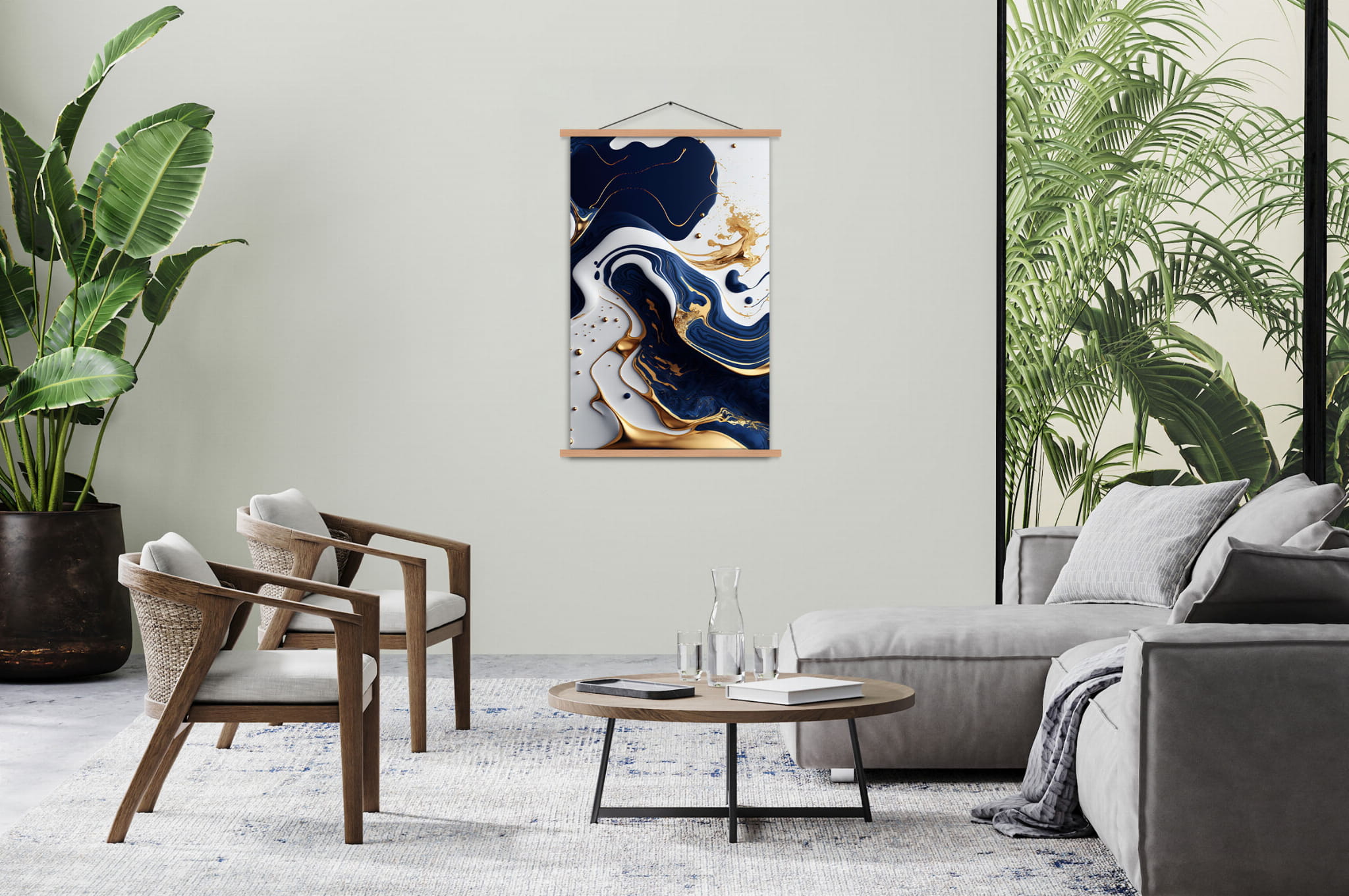 - Magnetic wooden strip system – securely holds prints without traditional frames
