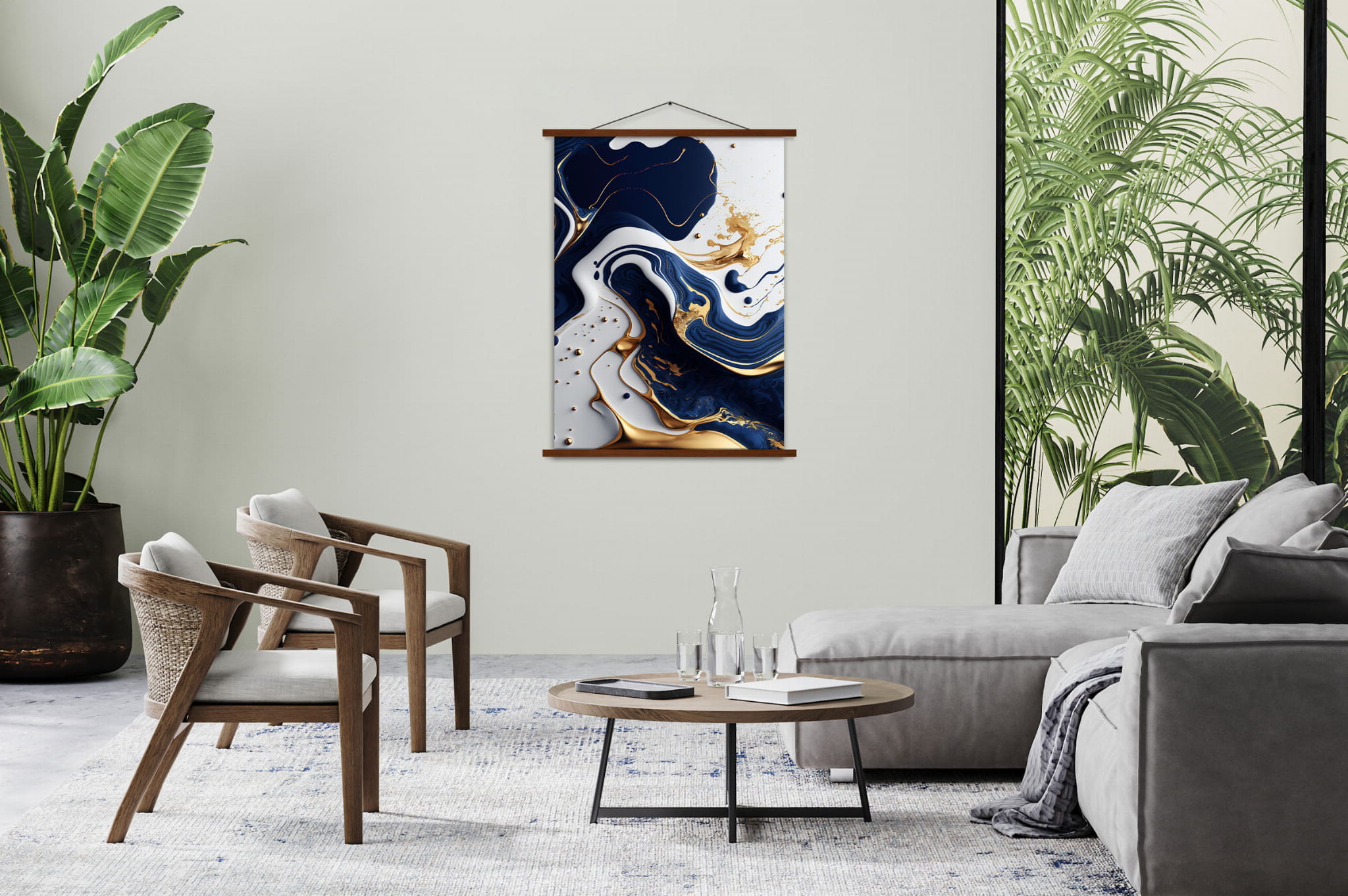 - Magnetic wooden strip system – securely holds prints without traditional frames