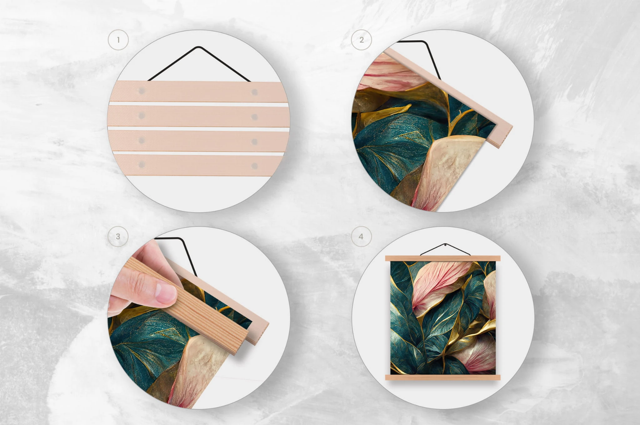 - Magnetic wooden strip system – securely holds prints without traditional frames
