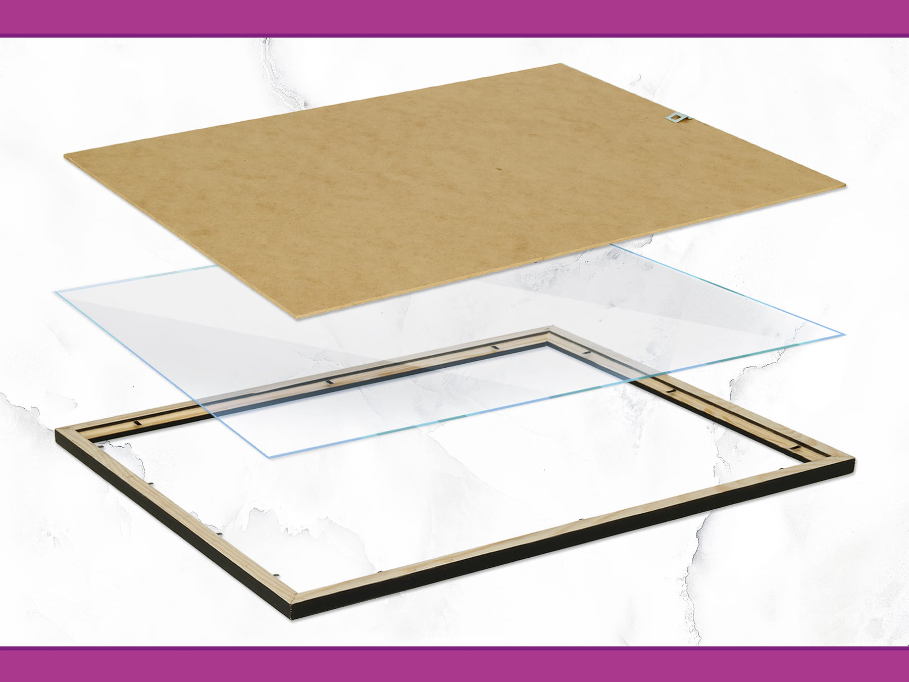 The frame is supplied with an acrylic front and rigid backing board and is ready for use; the decorative paper insert shown in visualisations is not included.