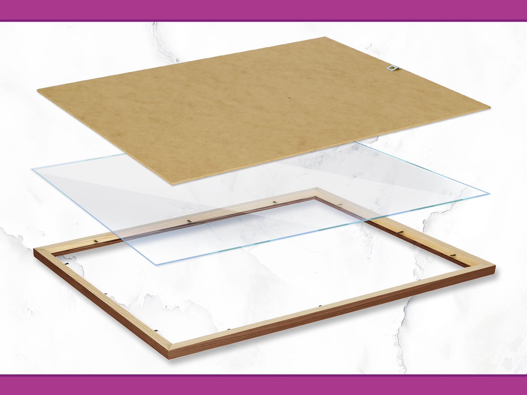 The frame is supplied with an acrylic front and rigid backing board and is ready for use; the decorative paper insert shown in visualisations is not included.