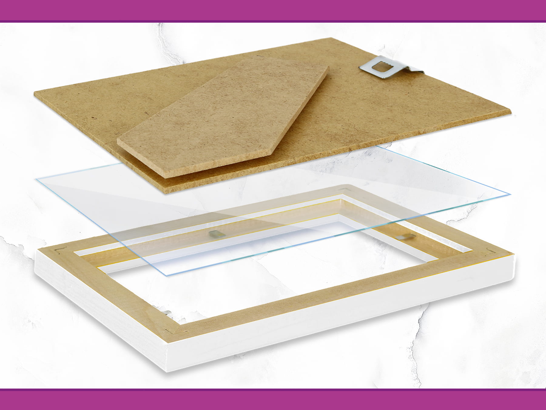 The frame is supplied with an acrylic front and rigid backing board and is ready for use; the decorative paper insert shown in visualisations is not included.