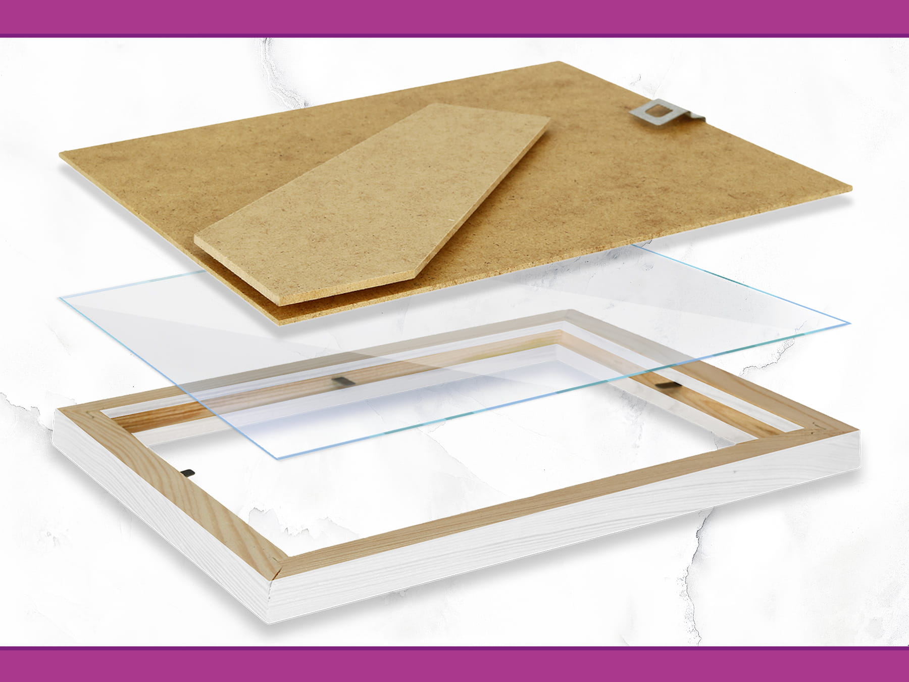 The frame is supplied with an acrylic front and rigid backing board and is ready for use; the decorative paper insert shown in visualisations is not included.