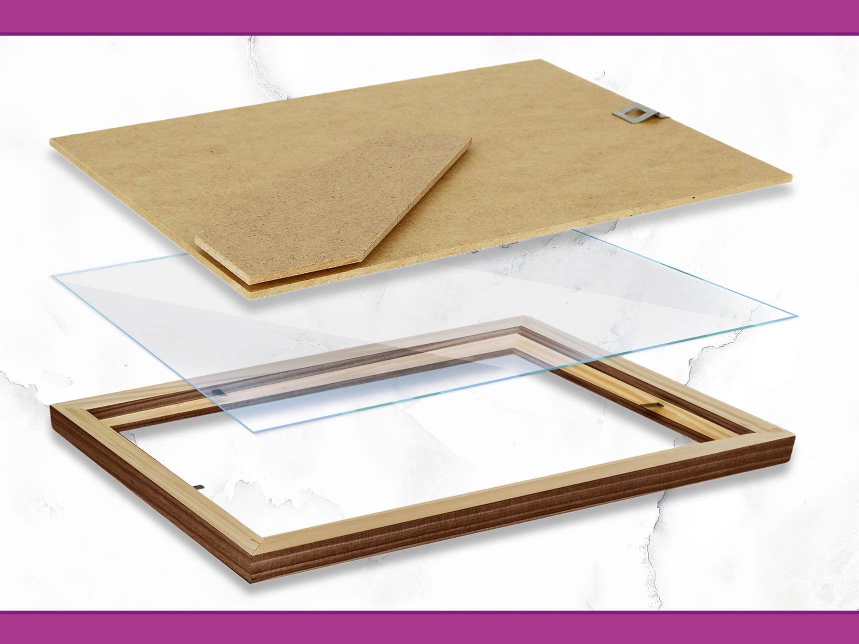 The frame is supplied with an acrylic front and rigid backing board and is ready for use; the decorative paper insert shown in visualisations is not included.