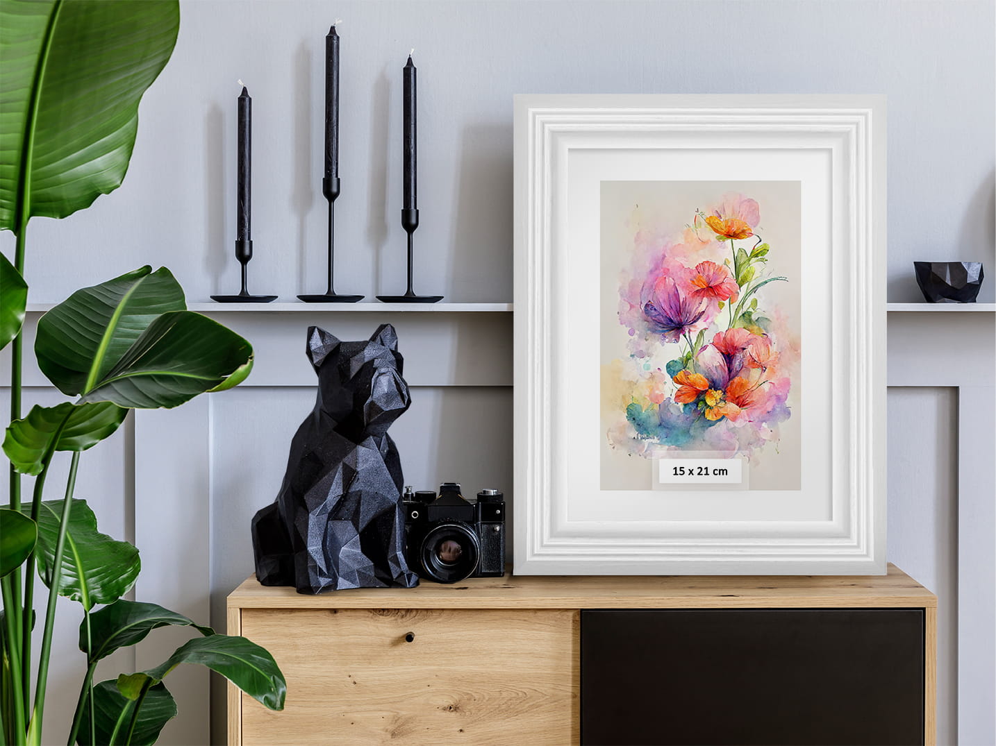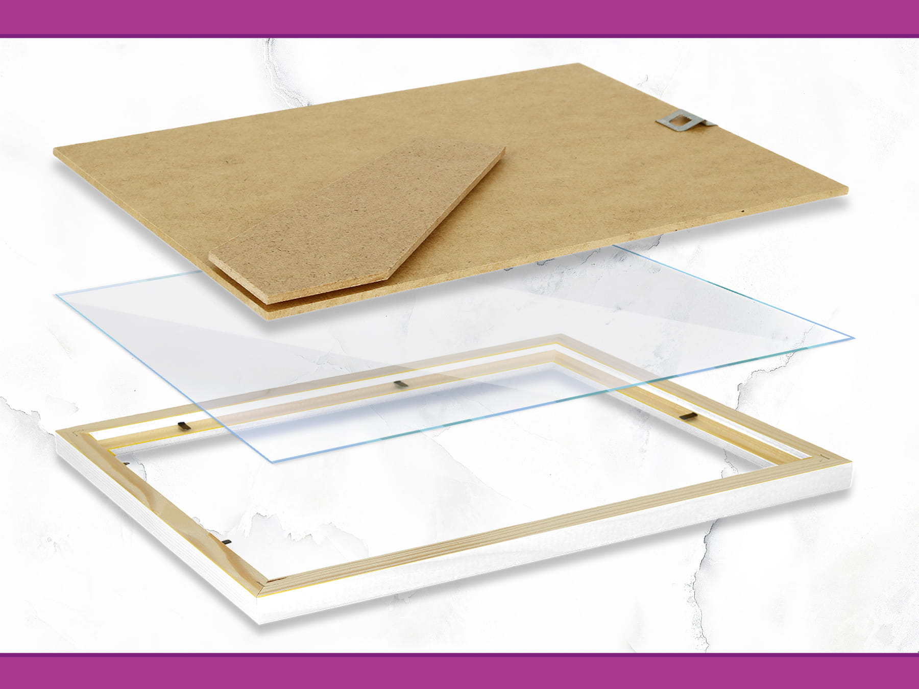 The frame is supplied with an acrylic front and rigid backing board and is ready for use; the decorative paper insert shown in visualisations is not included.