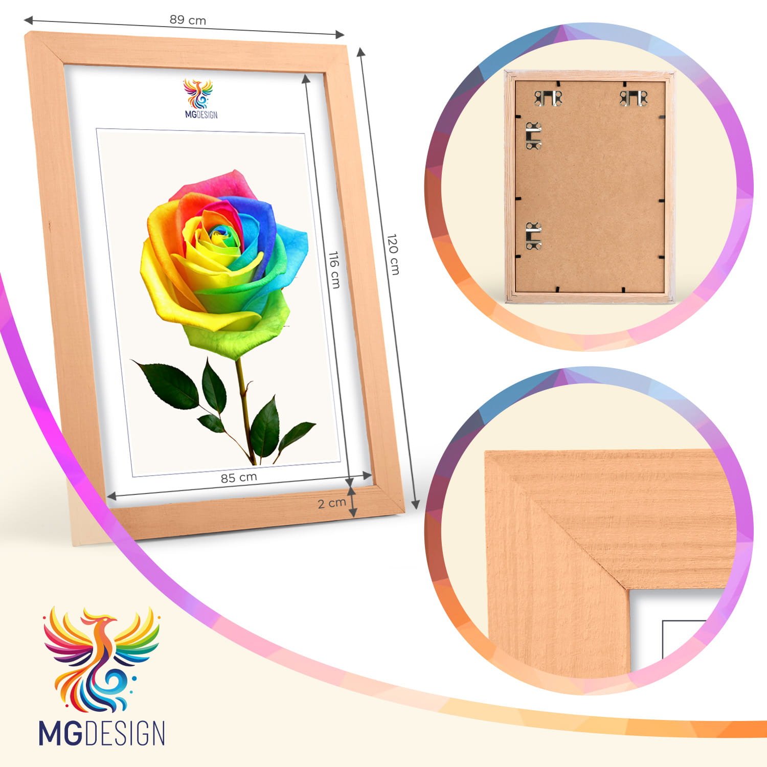 A wooden frame is an aesthetic and universal solution for framing photos, posters, graphics and decorative prints. The classic frame profile gives the frame an elegant look and clearly emphasises the presented motif without dominating the content. The frame is made of carefully processed natural wood, preserving the visible structure of the material, which gives the whole a natural and timeless character. The front of the frame is made of lightweight and damage-resistant plexiglass, which is a safer alternative to traditional glass and ensures good visibility of the framed work. The stable HDF board and solid metal hangers allow for quick installation and easy replacement of the contents without the use of tools.