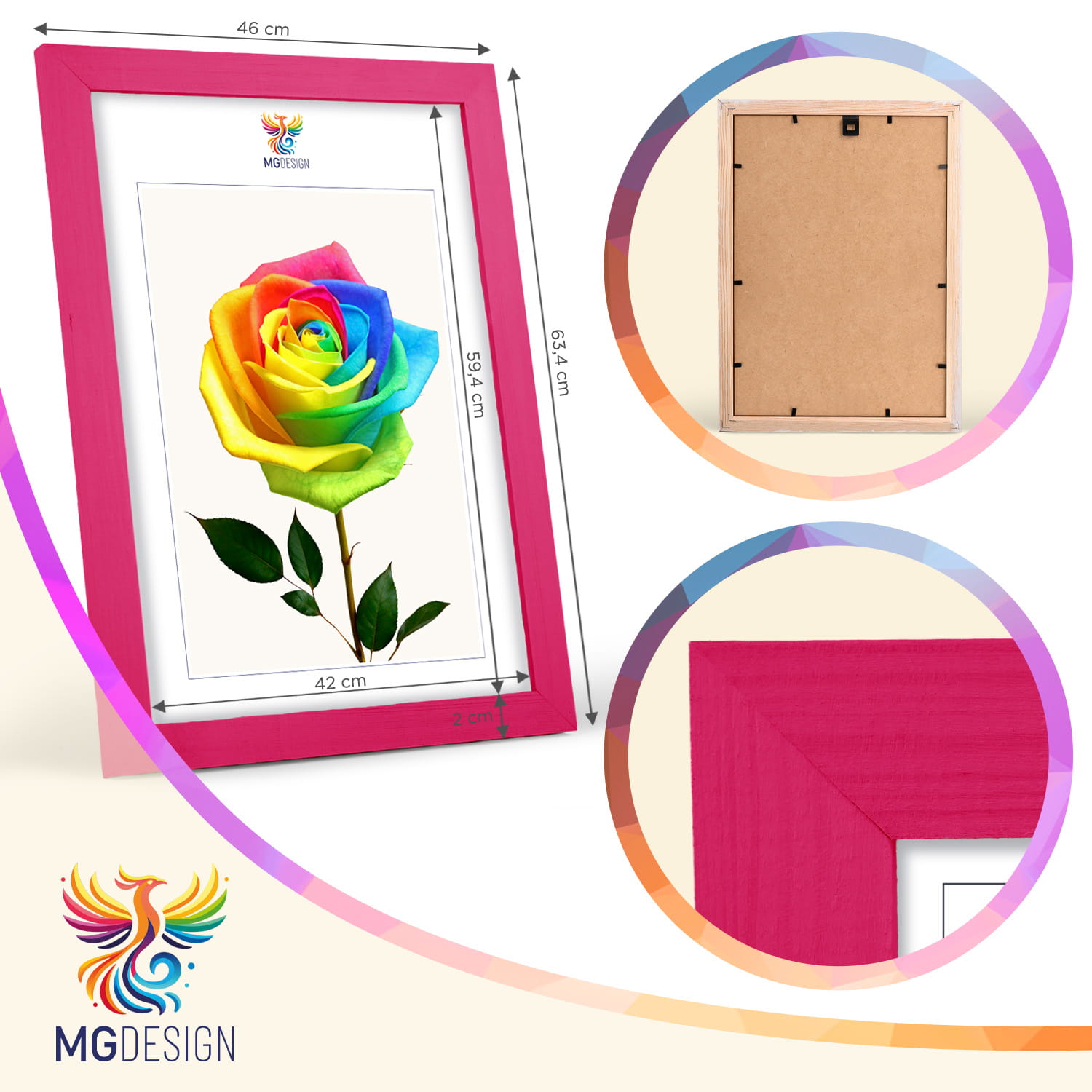 Pink photo frame A2 17 x 23 in (42 x 59,4 cm), made of natural wood