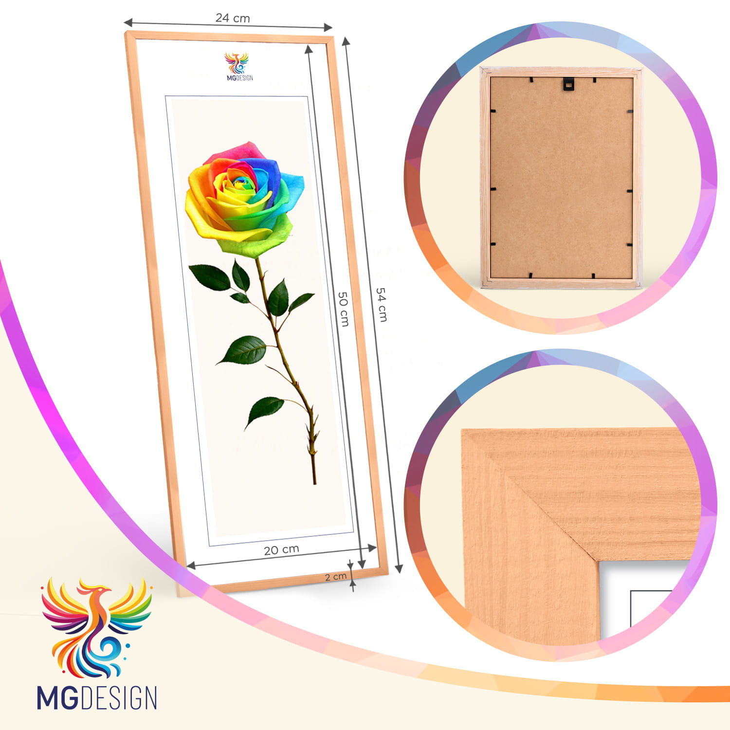The frames are made of natural wood, carefully processed to preserve the visible structure of the material, which gives the whole a natural and timeless character. The front of the frames is made of lightweight and damage-resistant plexiglass, which is a safer alternative to traditional glass and ensures good visibility of the framed works.