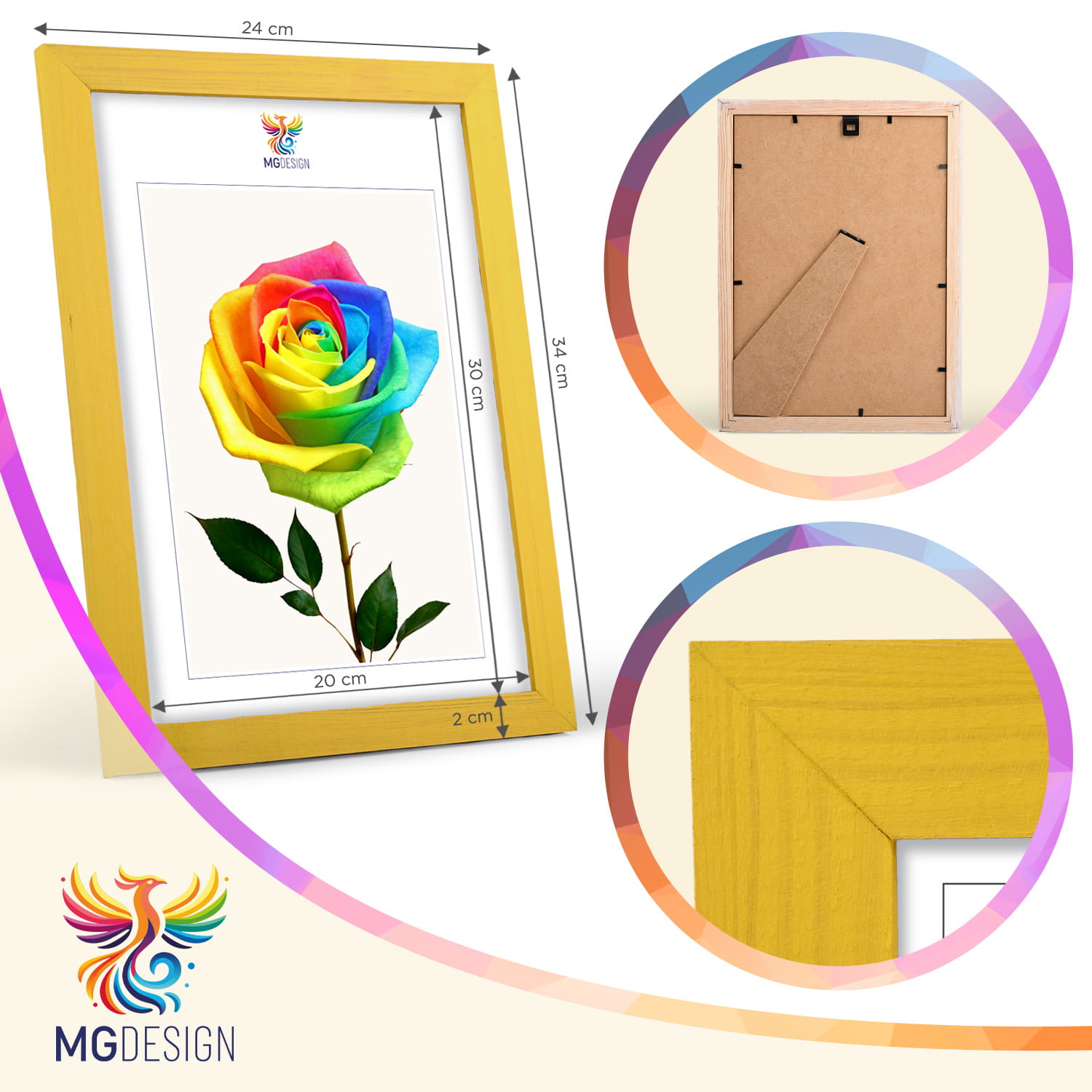 The frames are made of natural wood, carefully processed to preserve the visible structure of the material, which gives the whole a natural and timeless character. The front of the frames is made of lightweight and damage-resistant plexiglass, which is a safer alternative to traditional glass and ensures good visibility of the framed works.