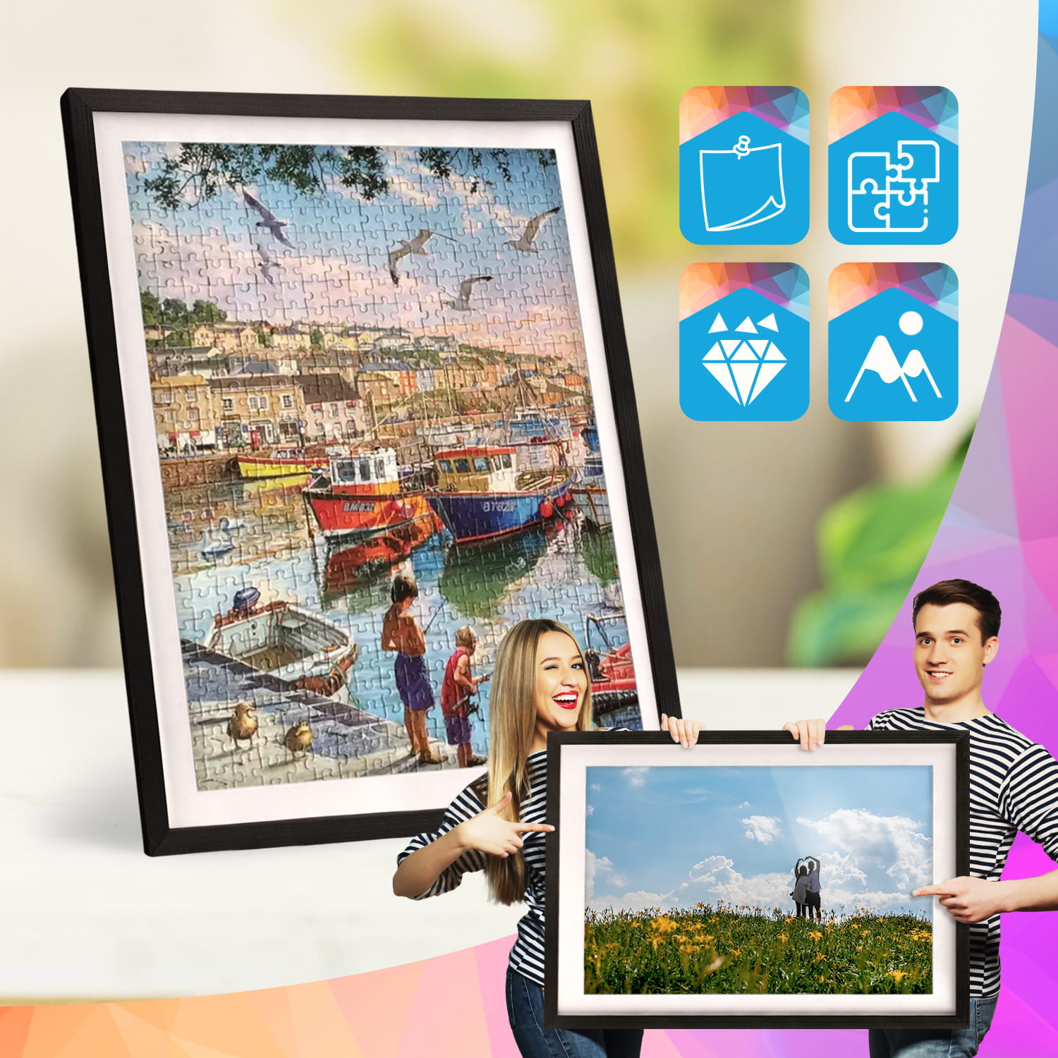 The frames are made of natural wood, carefully processed to preserve the visible structure of the material, which gives the whole a natural and timeless character. The front of the frames is made of lightweight and damage-resistant plexiglass, which ensures good visibility of the framed works and greater safety compared to traditional glass.