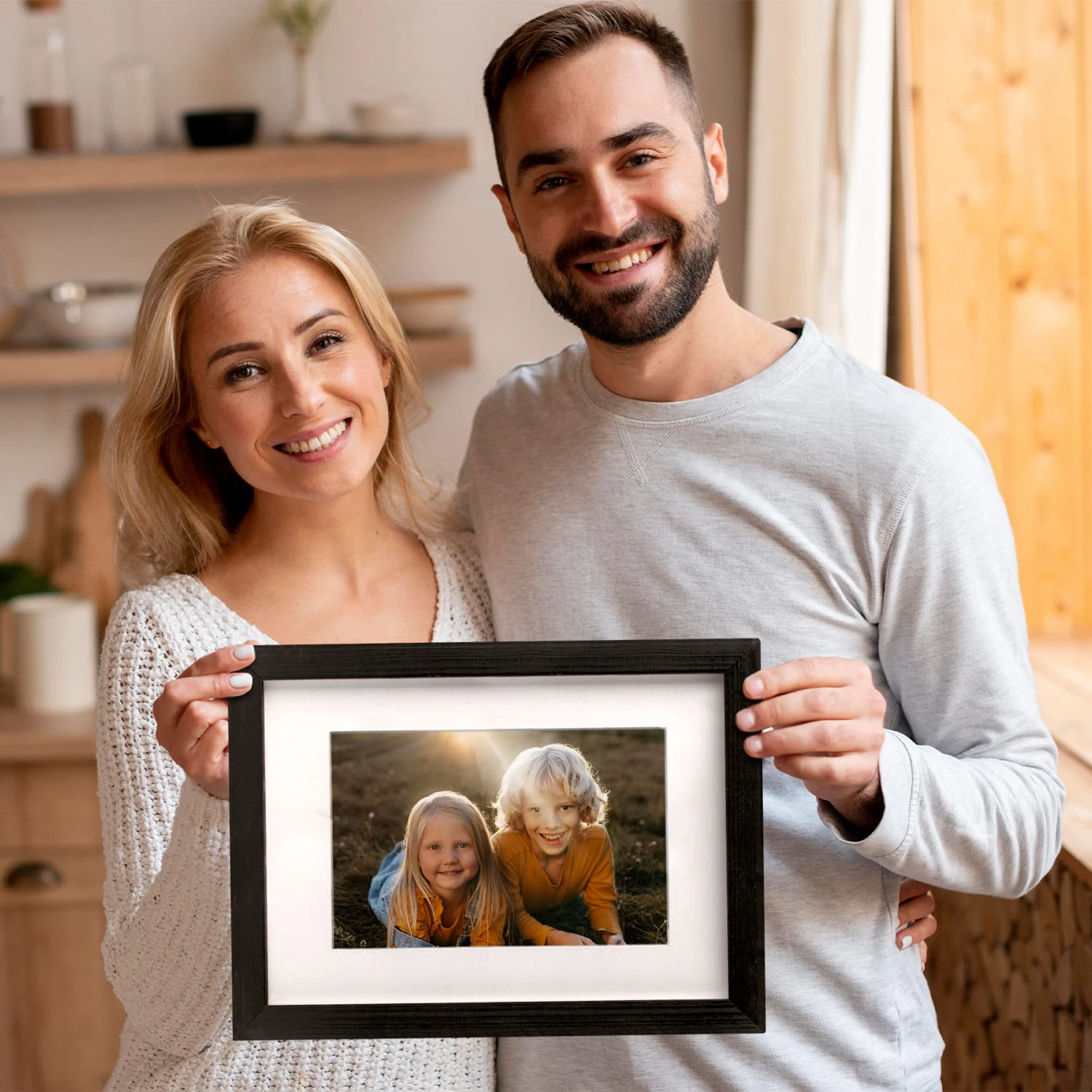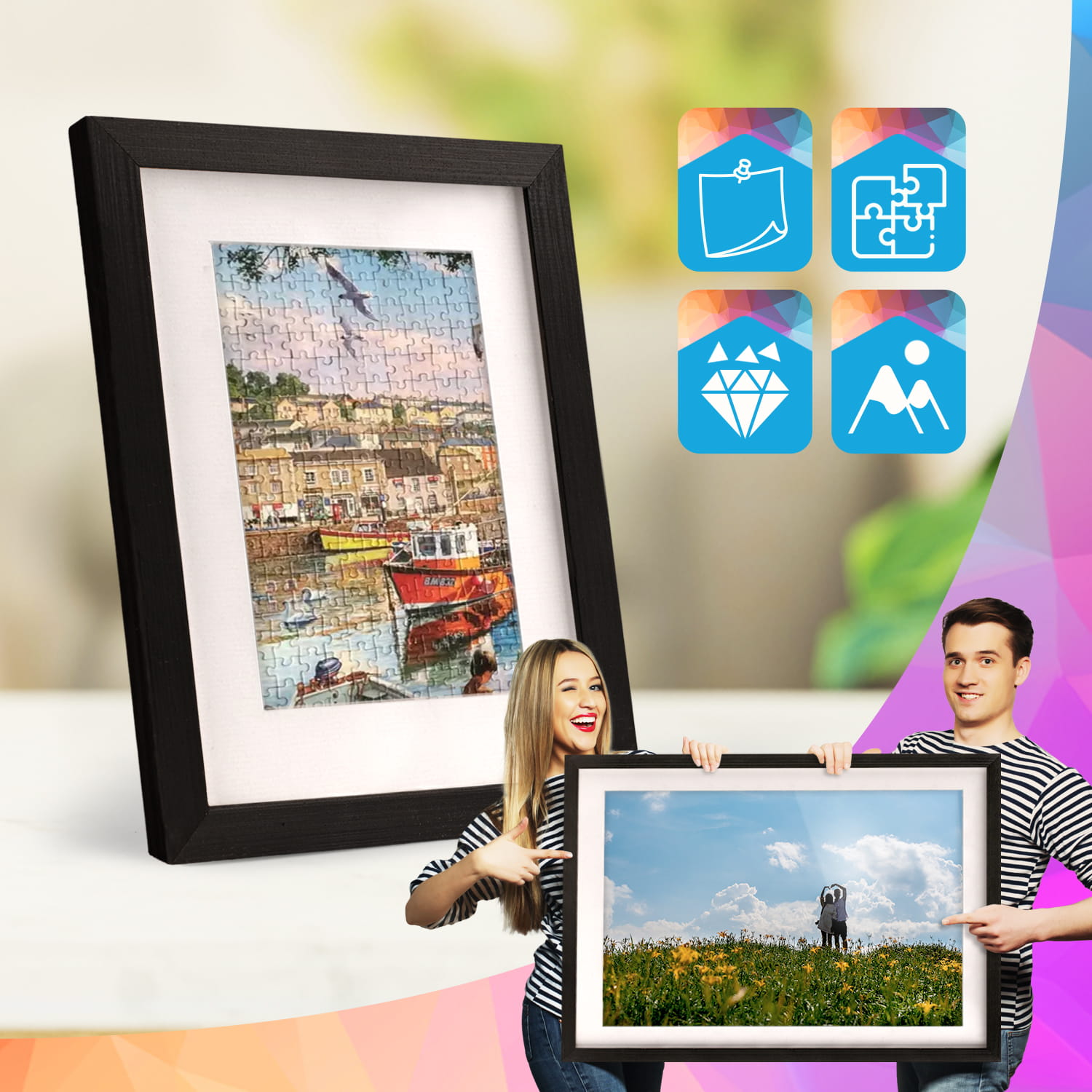 The frames can be placed on furniture or hung on the wall. Thanks to their high profile, they create a modern effect of distancing the images from the surface, which looks good in both home and commercial interiors.