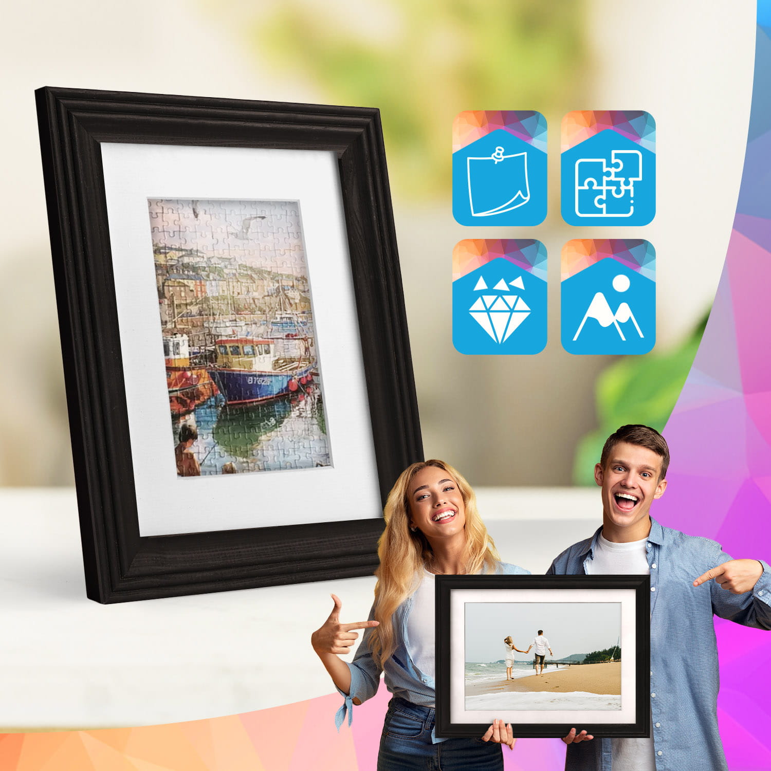 This set of milled wooden frames is an aesthetic and consistent solution for framing photographs, posters, graphics and art prints. The decorative, precisely crafted frame profile gives the entire composition an elegant character and emphasises the presented motifs, maintaining an orderly and harmonious appearance.