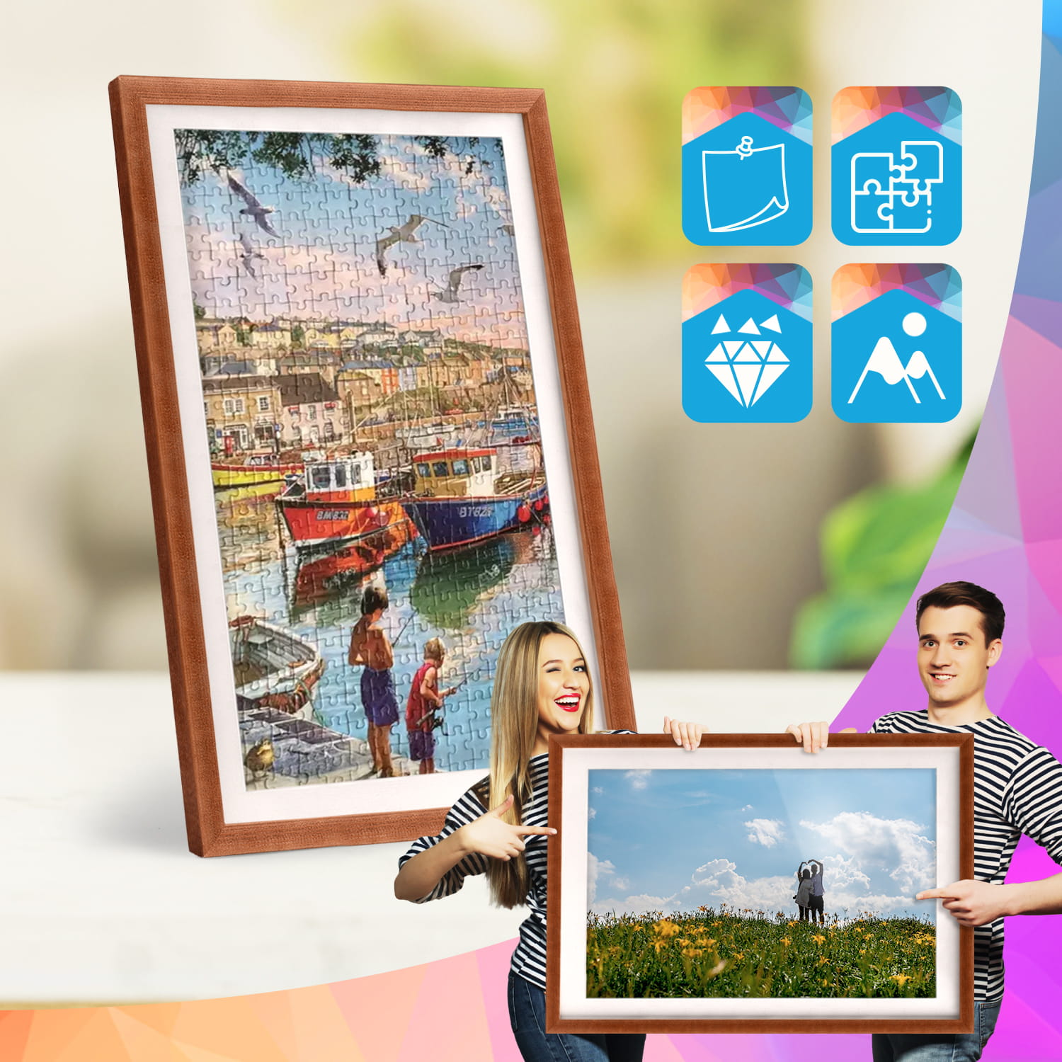 The frames can be placed on furniture or hung on the wall. Thanks to their high profile, they create a modern effect of distancing the images from the surface, which looks good in both home and commercial interiors.