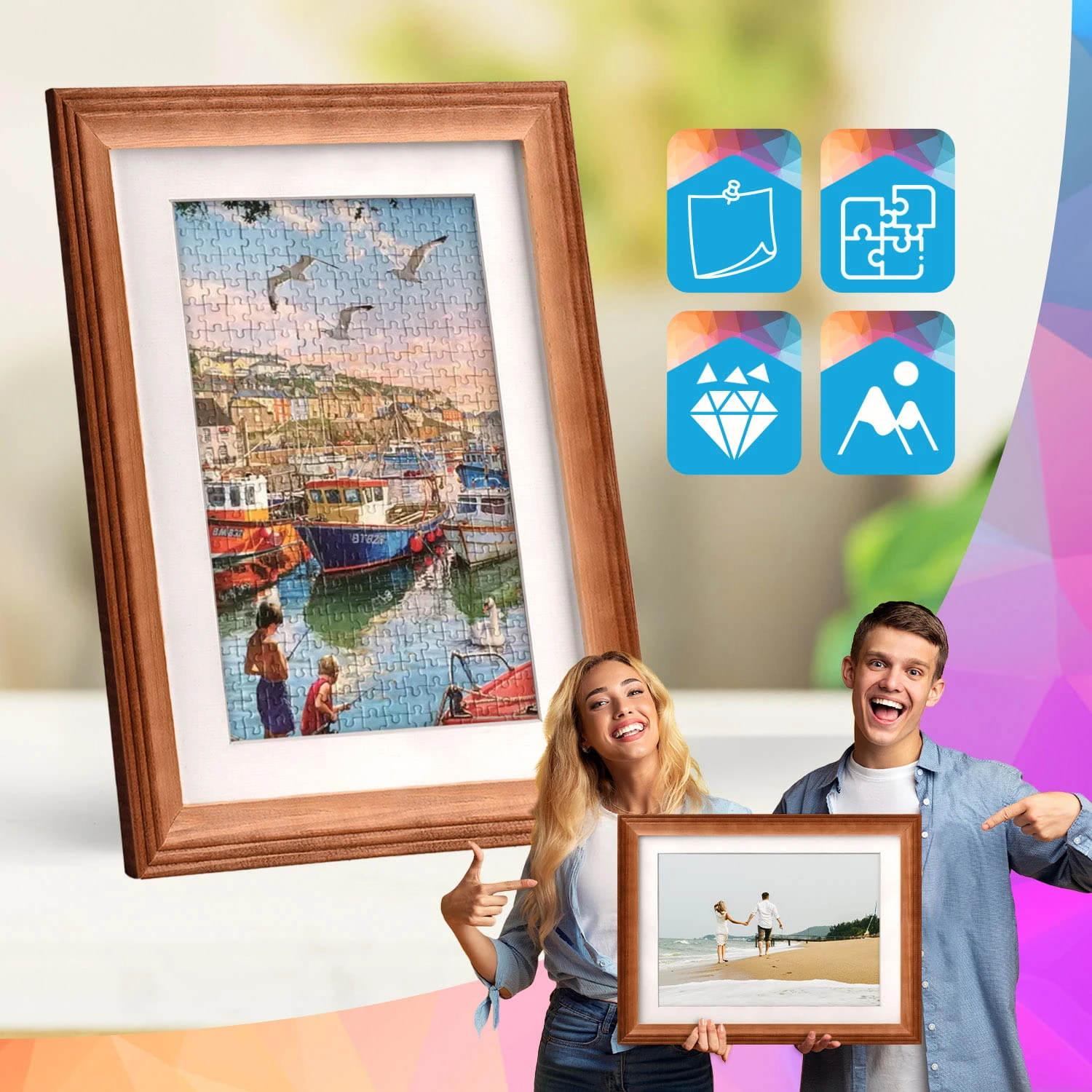 The frames are made of natural wood, carefully processed to preserve the visible structure of the material, which gives the whole a natural and timeless character. The front of the frames is made of lightweight and damage-resistant plexiglass, ensuring safety and good visibility of the framed works compared to traditional glass.