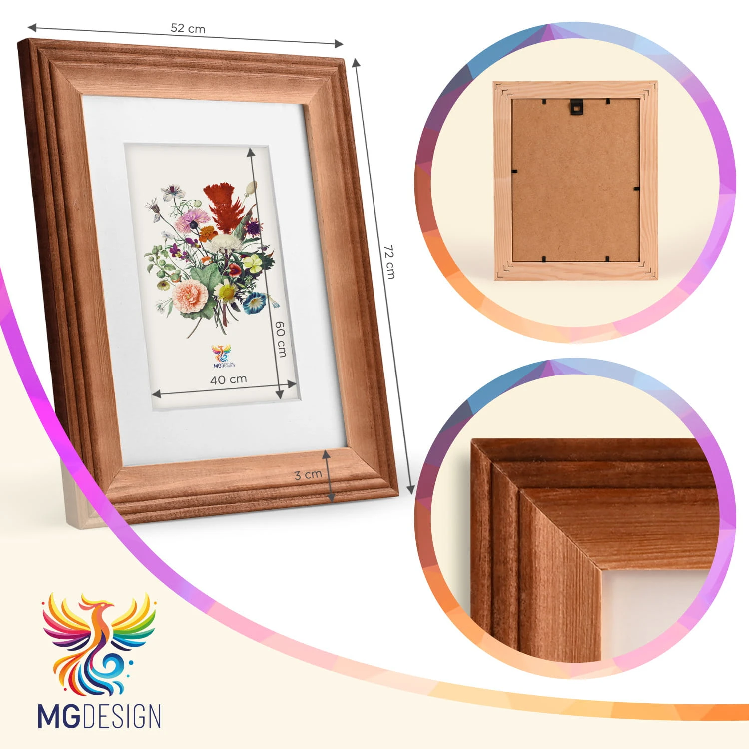 The frames are made of natural wood, carefully processed to preserve the visible structure of the material, which gives the whole a natural and timeless character. The front of the frames is made of lightweight and damage-resistant plexiglass, ensuring safety and good visibility of the framed works compared to traditional glass.