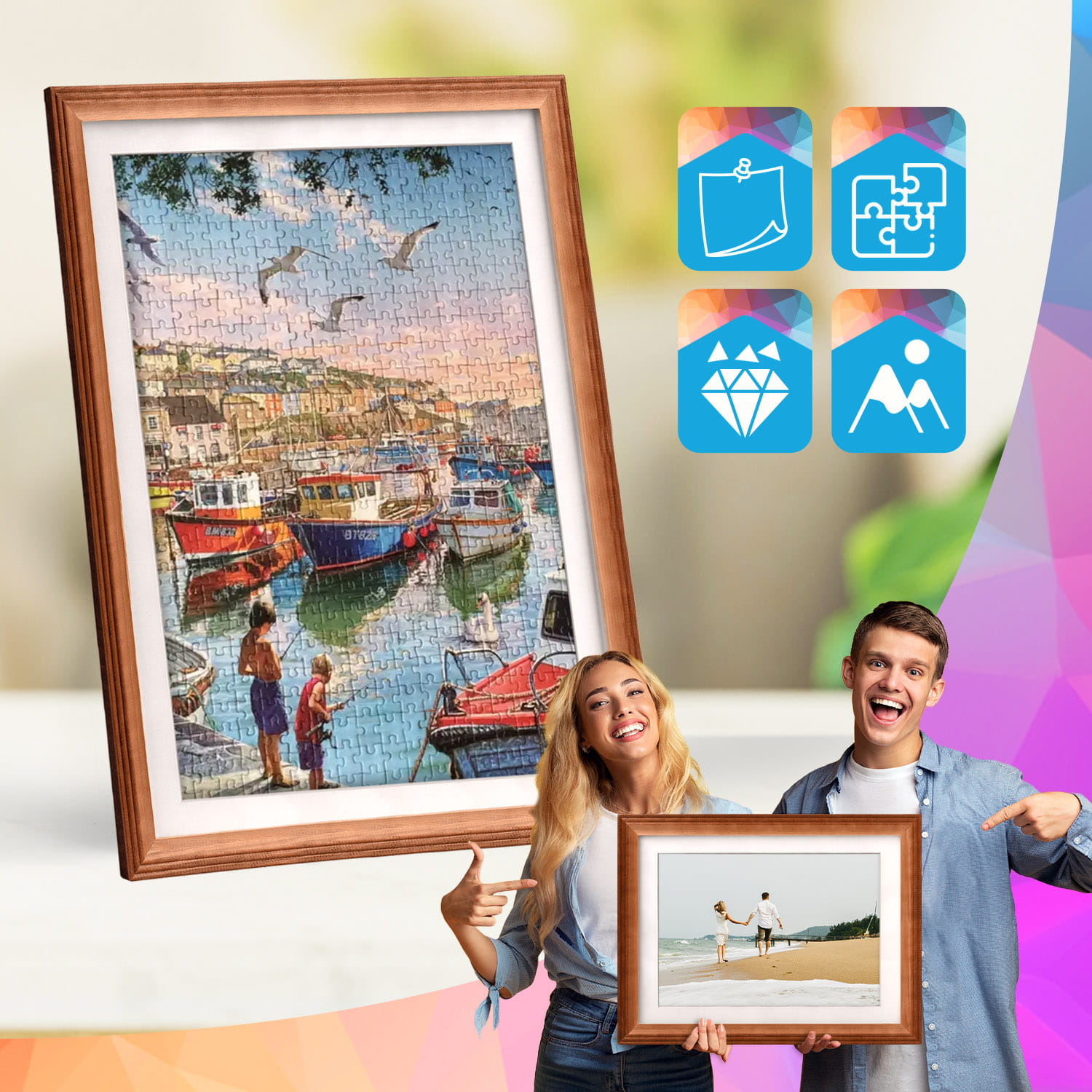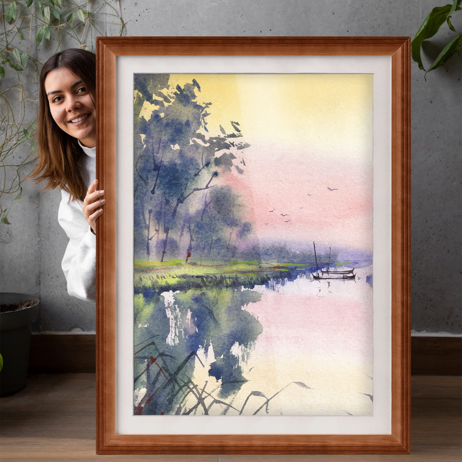 The frames are made of natural wood, carefully processed to preserve the visible structure of the material, which gives the whole a natural and timeless character. The front of the frames is made of lightweight and damage-resistant plexiglass, ensuring safety and good visibility of the framed works compared to traditional glass.