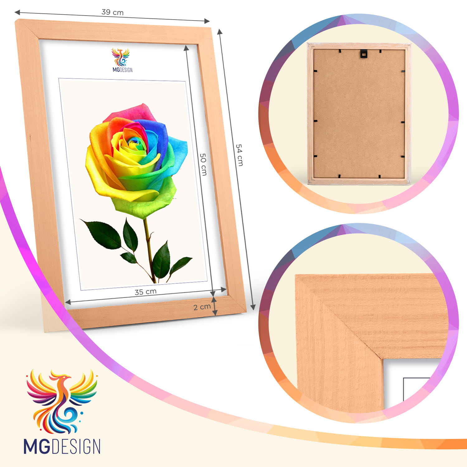 The frames are made of natural wood, carefully processed to preserve the visible structure of the material, which gives the whole a natural and timeless character. The front of the frames is made of lightweight and damage-resistant plexiglass, which is a safer alternative to traditional glass and ensures good visibility of the framed works.