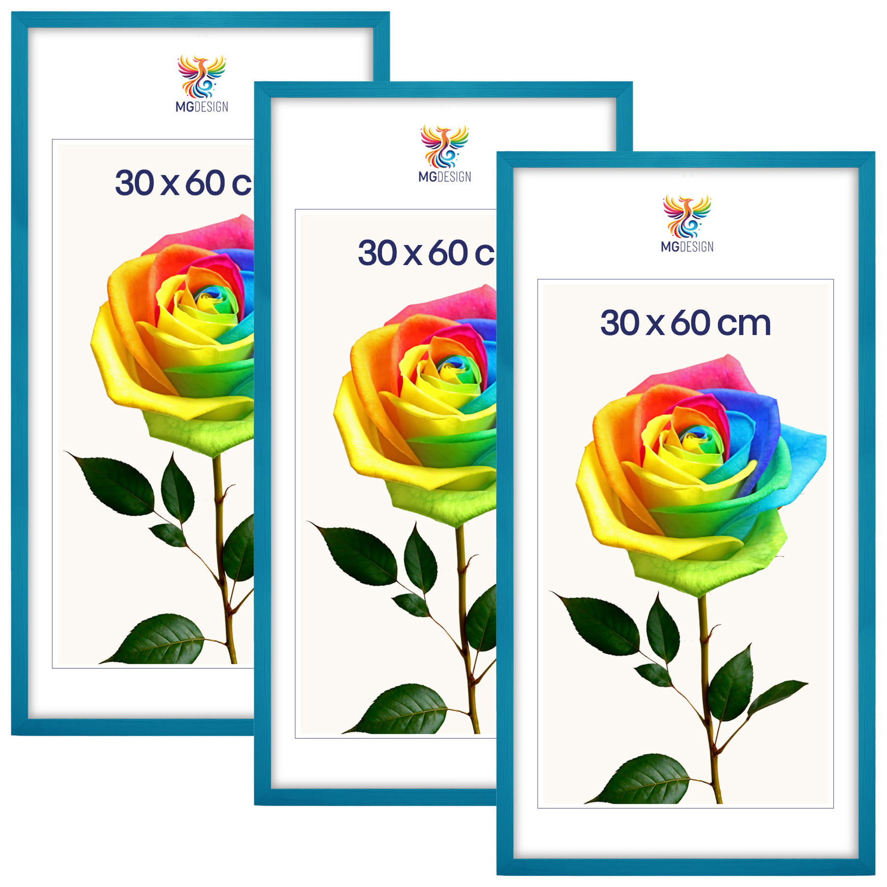 Set of 3 Turquoise photo frames 12 x 24 in (30 x 60 cm), made of natural wood