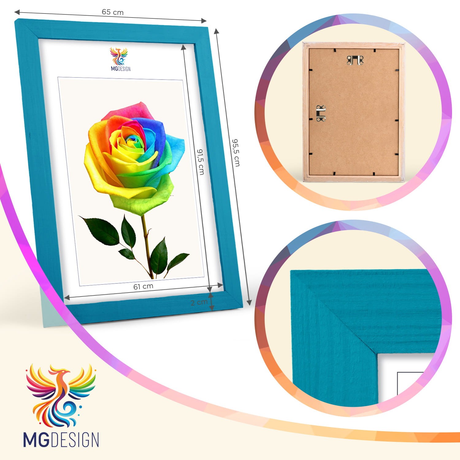Set of 3 Turquoise photo frames 24 x 36 in (61 x 91,5 cm), made of natural wood