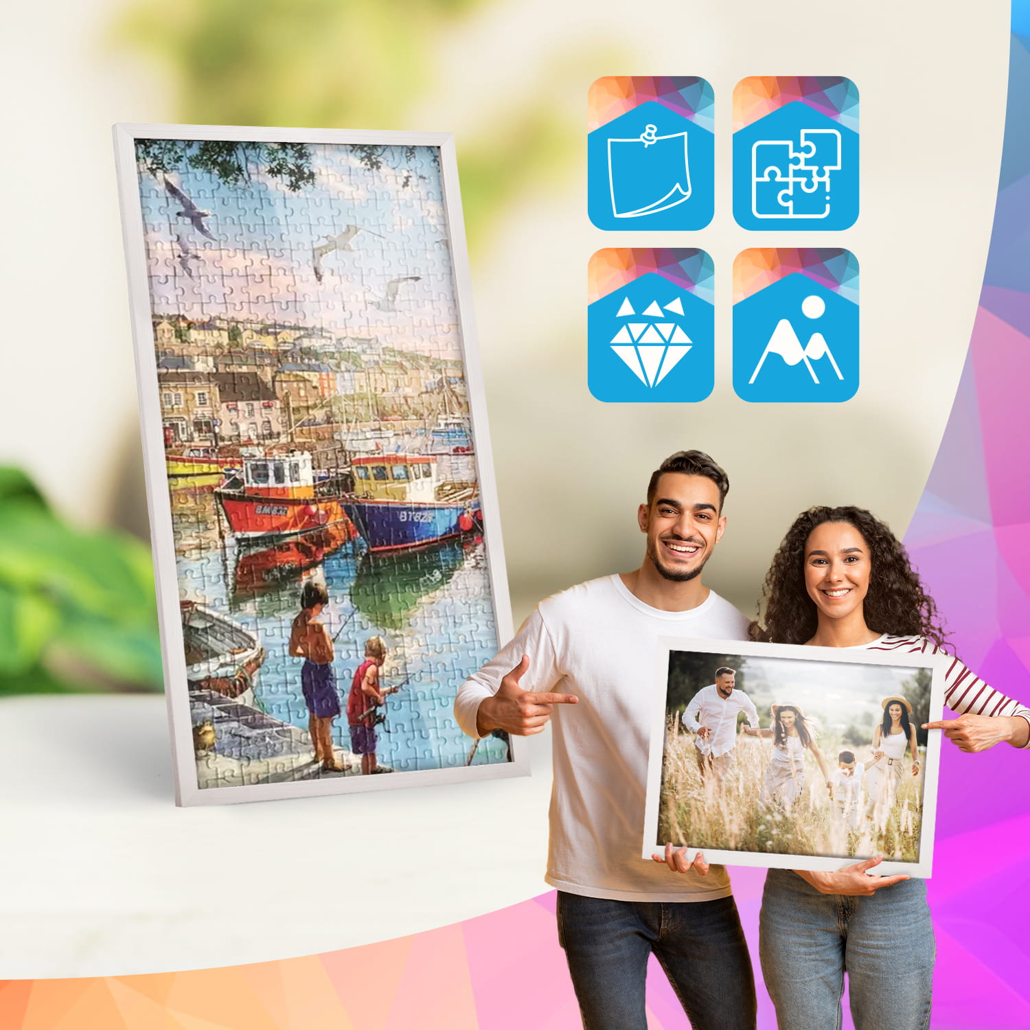 The frames are made of natural wood, carefully processed to preserve the visible structure of the material, which gives the whole a natural and timeless character. The front of the frames is made of lightweight and damage-resistant plexiglass, which is a safer alternative to traditional glass and ensures good visibility of the framed works.