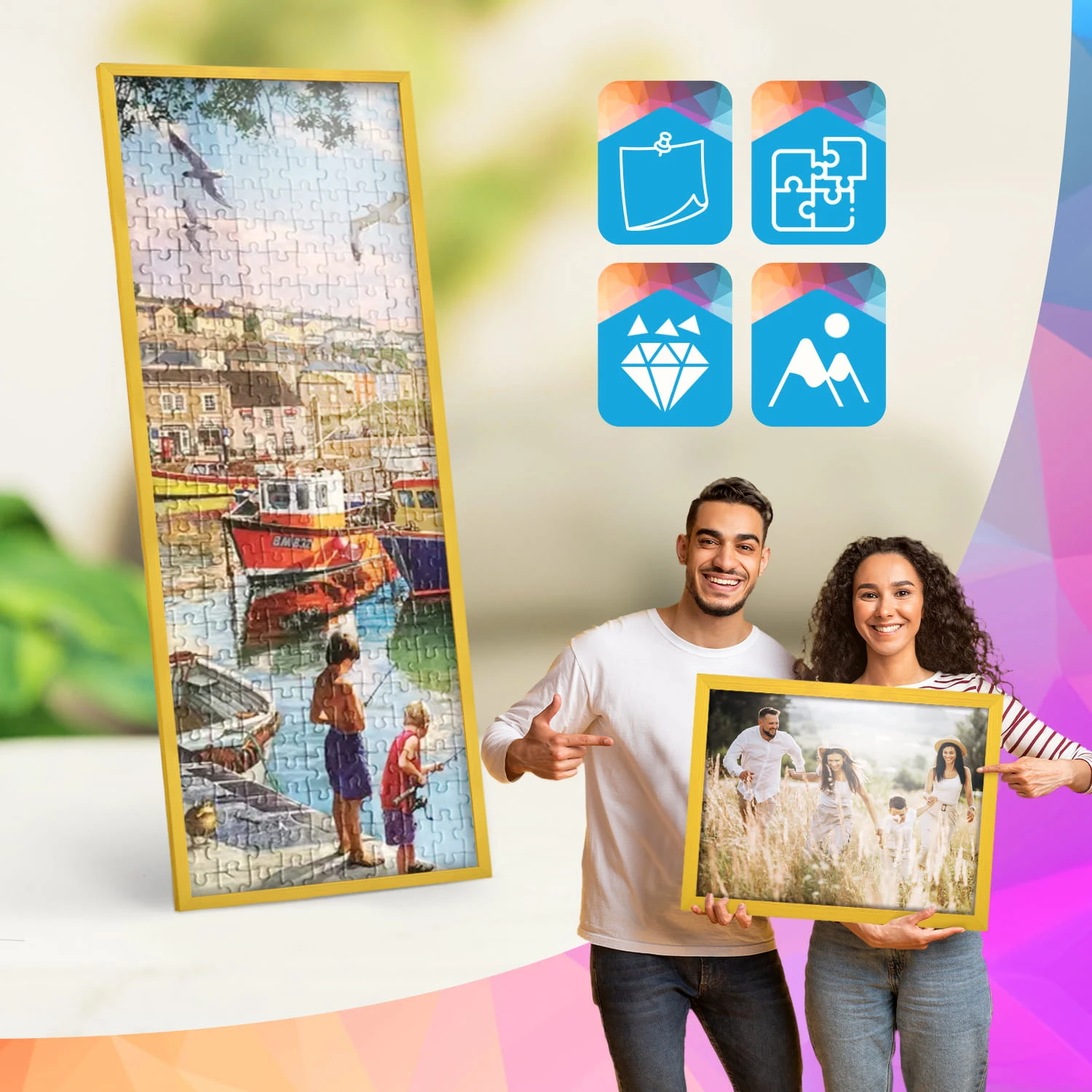 The frames are made of natural wood, carefully processed to preserve the visible structure of the material, which gives the whole a natural and timeless character. The front of the frames is made of lightweight and damage-resistant plexiglass, which is a safer alternative to traditional glass and ensures good visibility of the framed works.