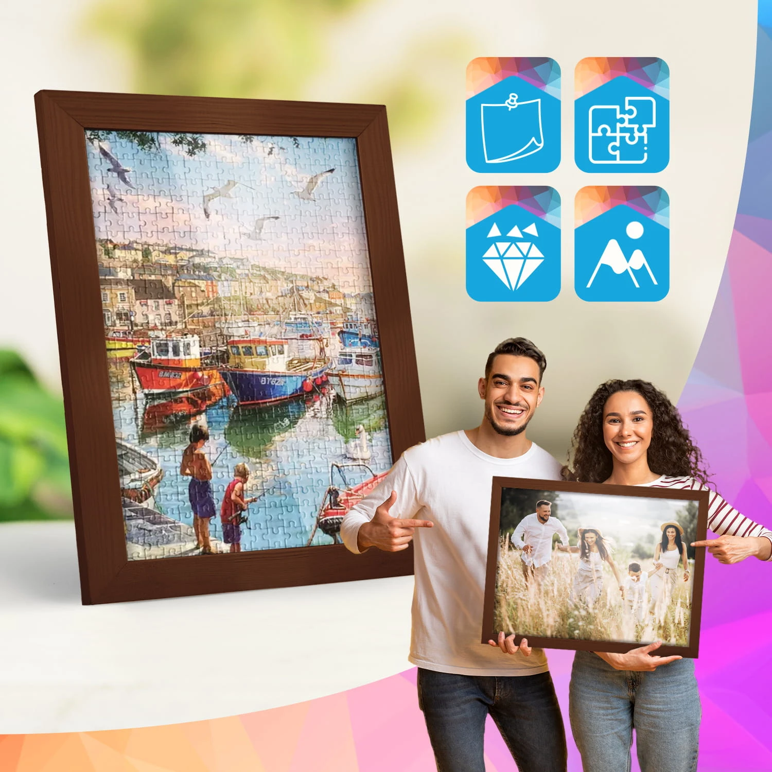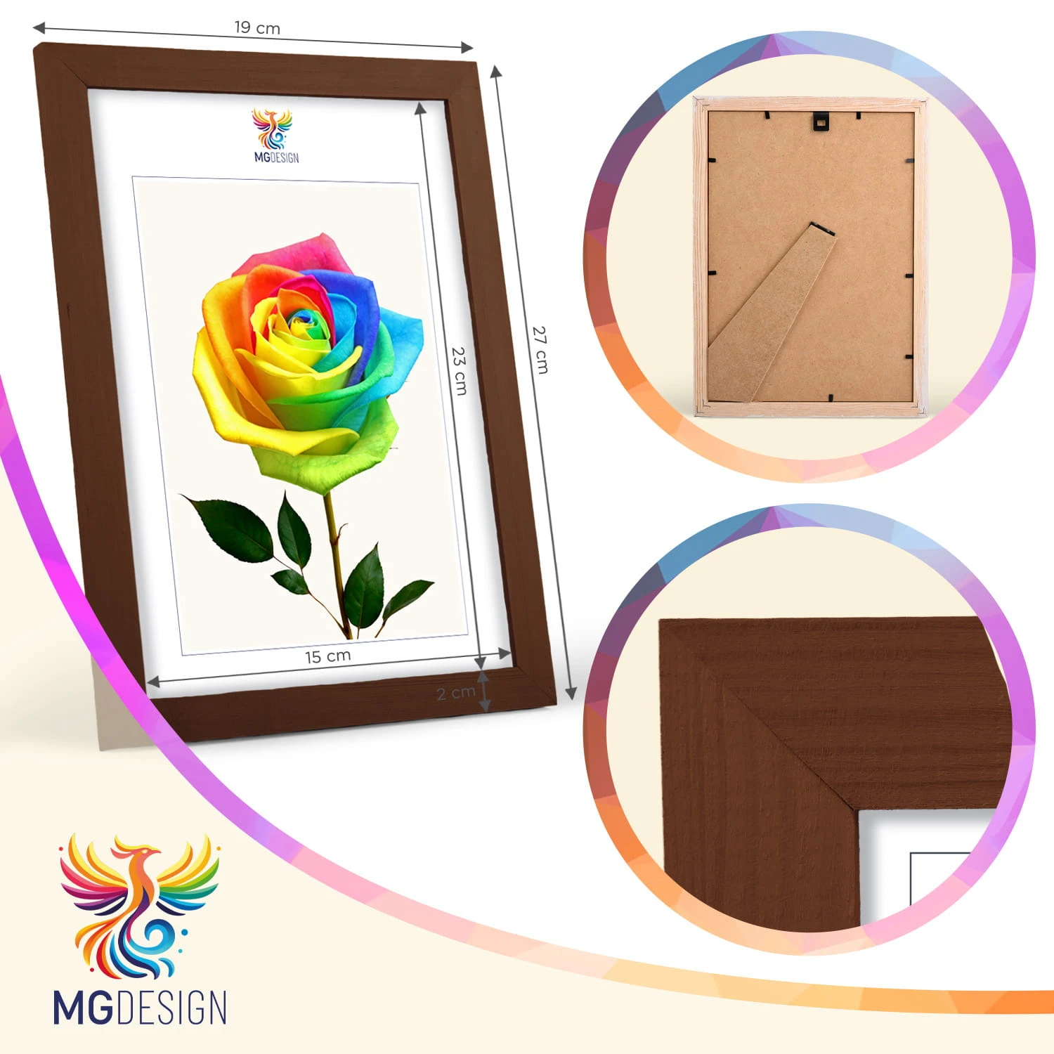 The frames are made of natural wood, carefully processed to preserve the visible structure of the material, which gives the whole a natural and timeless character. The front of the frames is made of lightweight and damage-resistant plexiglass, which is a safer alternative to traditional glass and ensures good visibility of the framed works.