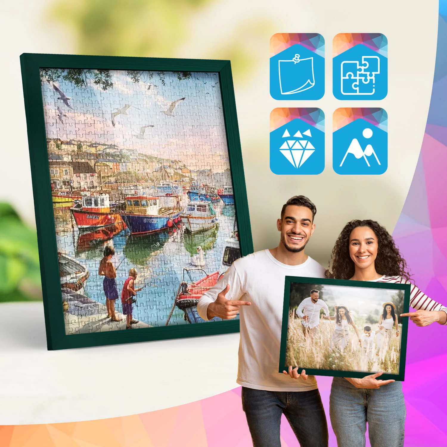 The frames are made of natural wood, carefully processed to preserve the visible structure of the material, which gives the whole a natural and timeless character. The front of the frames is made of lightweight and damage-resistant plexiglass, which is a safer alternative to traditional glass and ensures good visibility of the framed works.