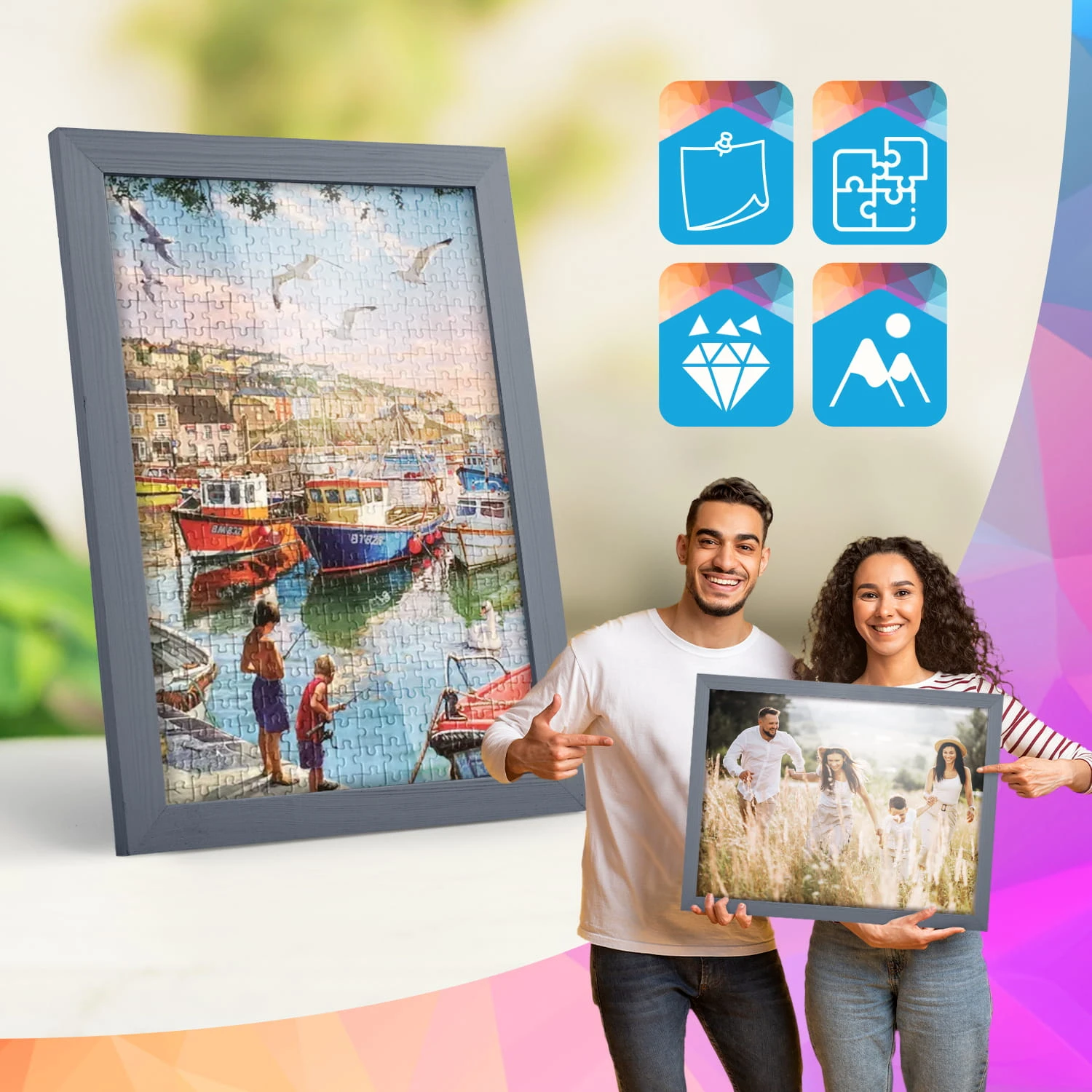 The frames are made of natural wood, carefully processed to preserve the visible structure of the material, which gives the whole a natural and timeless character. The front of the frames is made of lightweight and damage-resistant plexiglass, which is a safer alternative to traditional glass and ensures good visibility of the framed works.