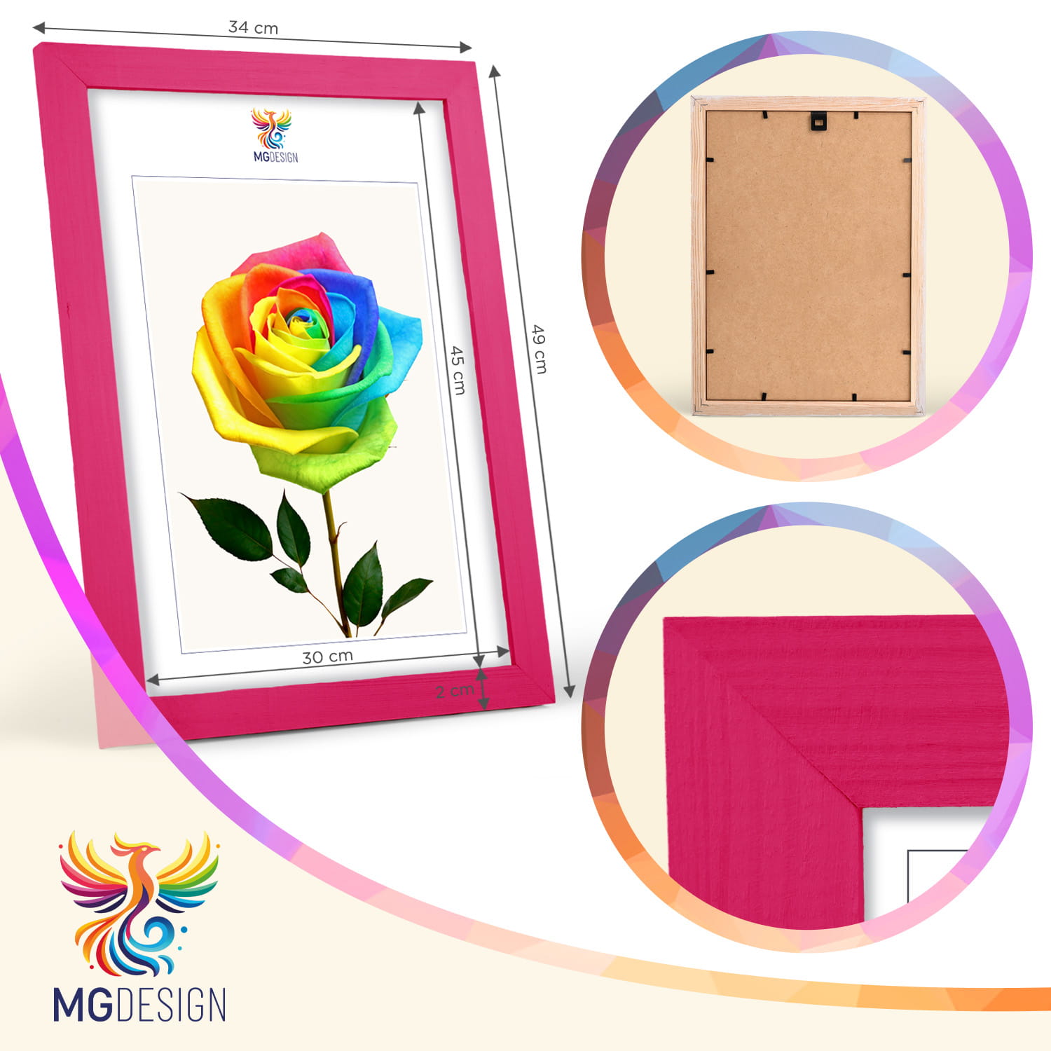 The frames are made of natural wood, carefully processed to preserve the visible structure of the material, which gives the whole a natural and timeless character. The front of the frames is made of lightweight and damage-resistant plexiglass, which is a safer alternative to traditional glass and ensures good visibility of the framed works.