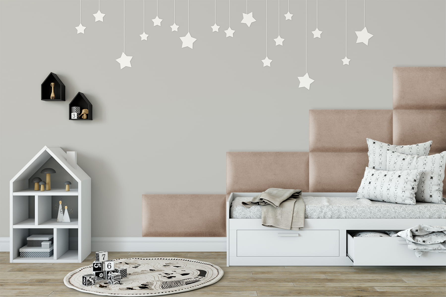The soft upholstered surface increases comfort and safety, making the panel ideal for use near children’s beds or play areas. Thanks to its sound-absorbing properties, it helps reduce noise and echo, improving acoustic comfort in bedrooms and children’s rooms. The modular design allows you to combine multiple panels to create larger headboards, feature walls or customised layouts tailored to your interior style.