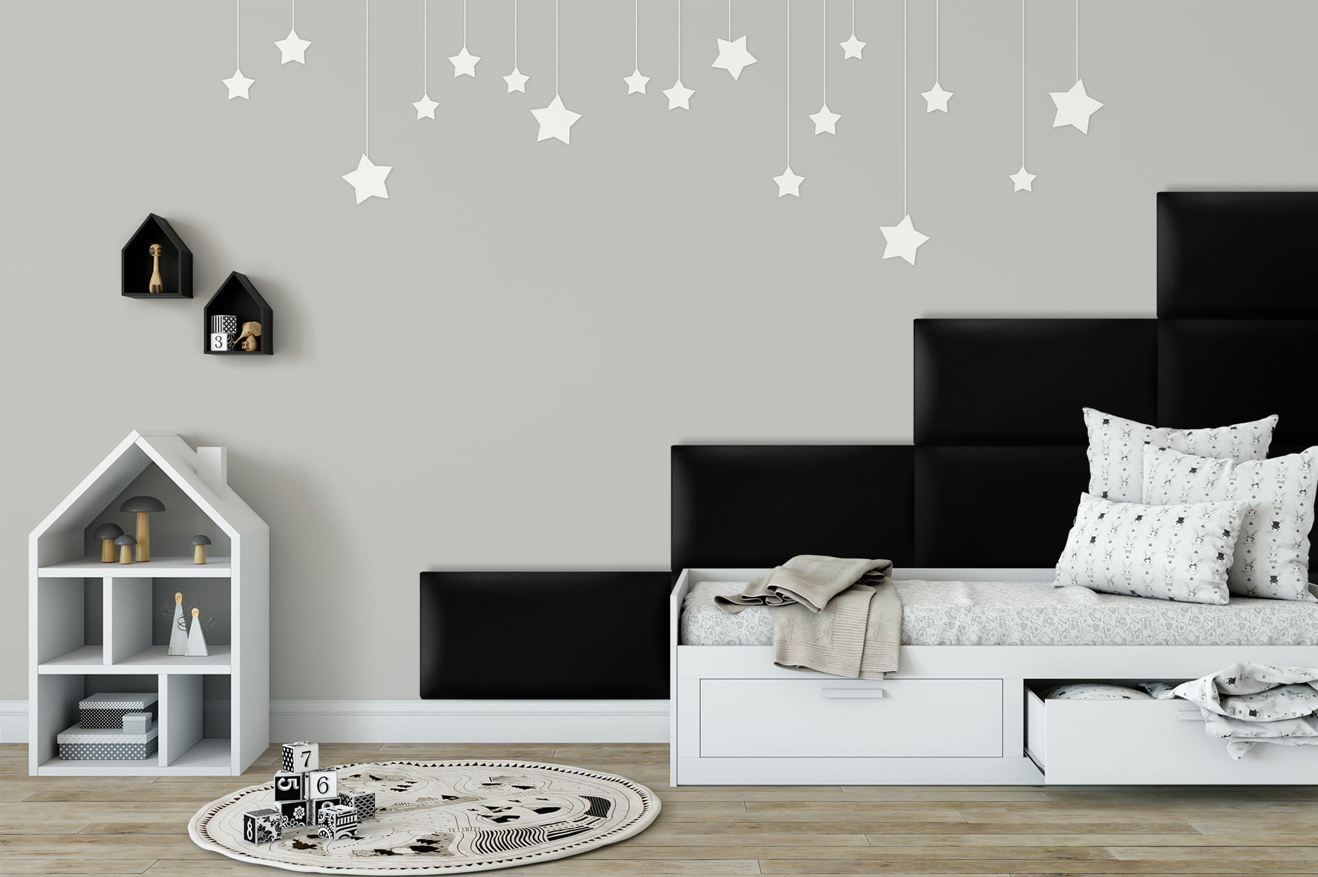 The soft upholstered surface increases comfort and safety, making the panel ideal for use near children’s beds or play areas. Thanks to its sound-absorbing properties, it helps reduce noise and echo, improving acoustic comfort in bedrooms and children’s rooms. The modular design allows you to combine multiple panels to create larger headboards, feature walls or customised layouts tailored to your interior style.