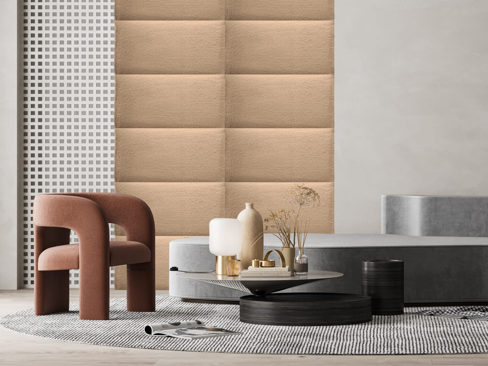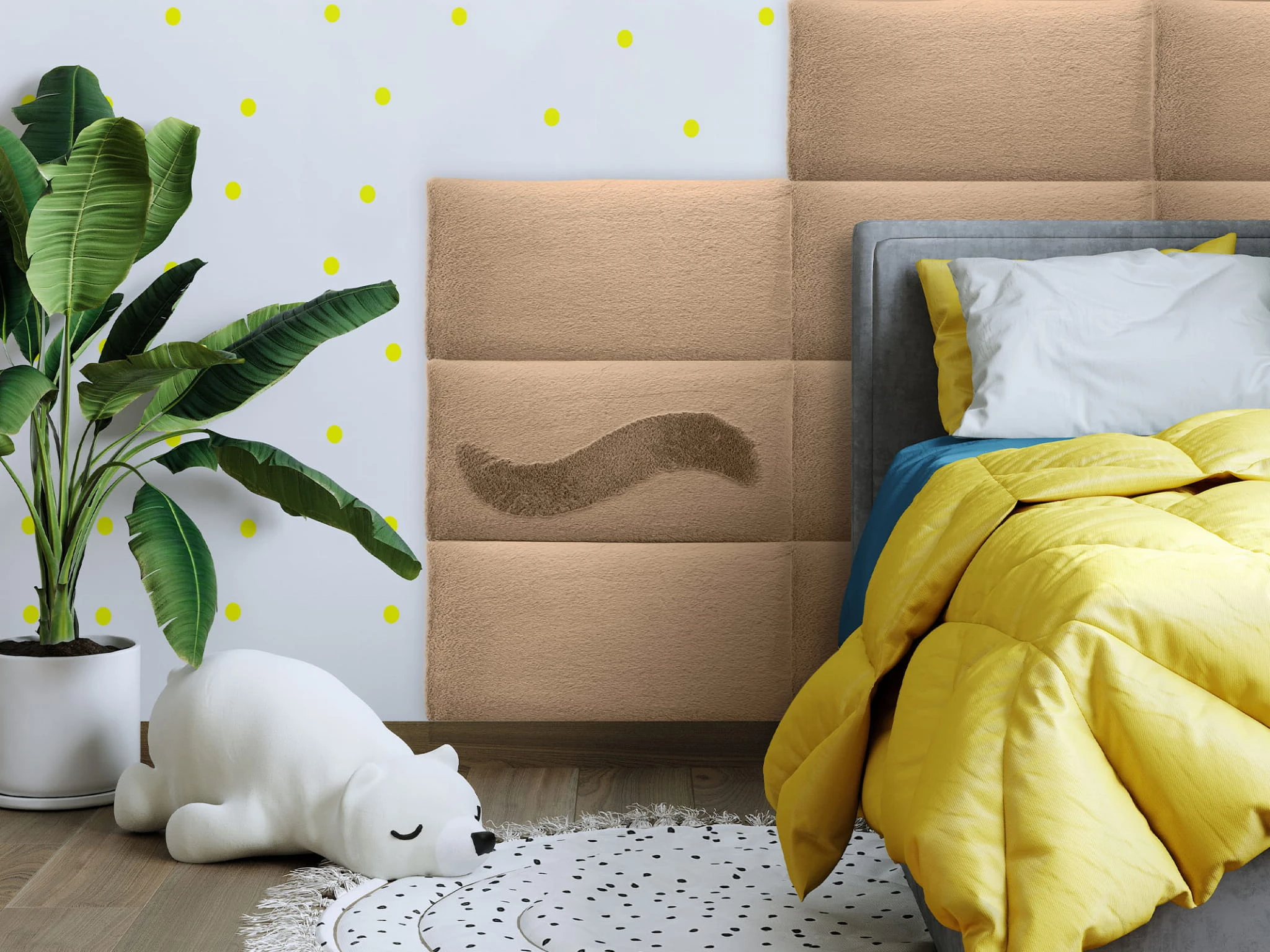 The soft upholstered surface increases comfort and safety, making the panel ideal for use near children’s beds or play areas. Thanks to its sound-absorbing properties, it helps reduce noise and echo, improving acoustic comfort in bedrooms and children’s rooms. The modular design allows you to combine multiple panels to create larger headboards, feature walls or customised layouts tailored to your interior style.